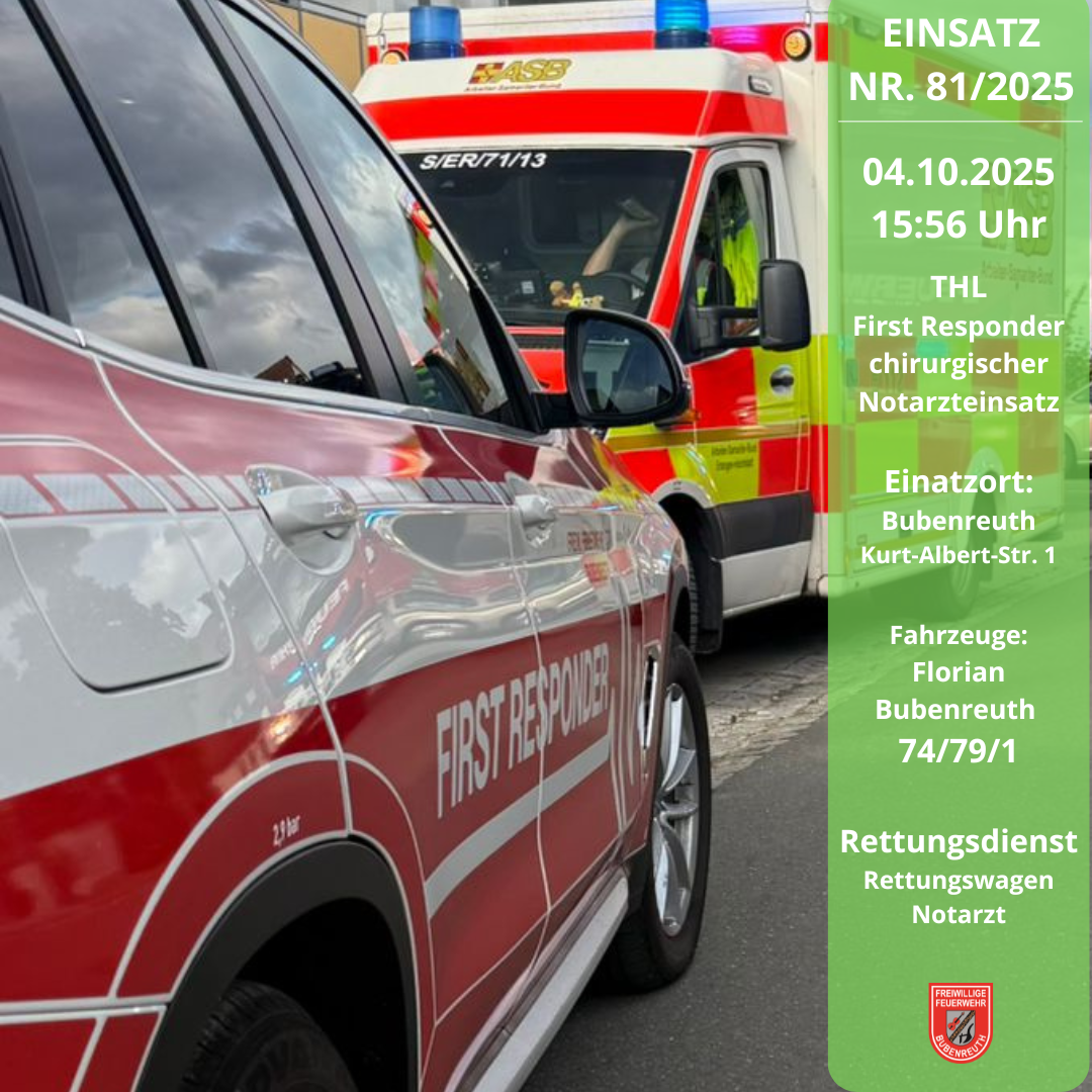 +++ 04.10.2025 / 15:56 Uhr --- Einsatz Nr. 081/2025 --- THL - First Responder / chirurgischer Notarzteinsatz --- Bubenreuth - Kurt-Albert-Straße --- Einsatz für den First Responder +++