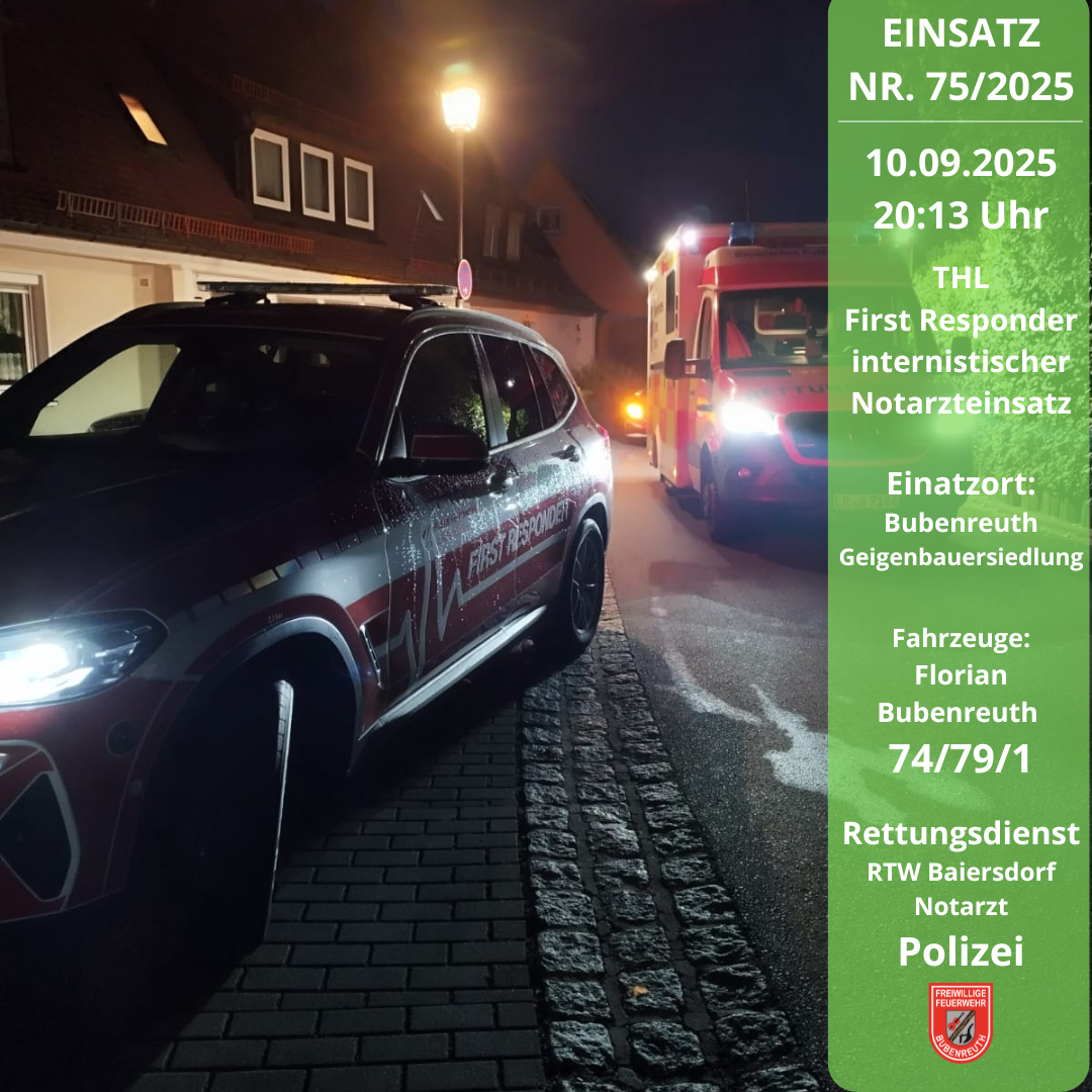 +++ 10.09.2025 / 20:13 Uhr --- Einsatz Nr. 075/2025 --- THL - First Responder / internistischer Notarzteinsatz --- Bubenreuth - Geigenbauersiedlung --- Einsatz für den First Responder +++