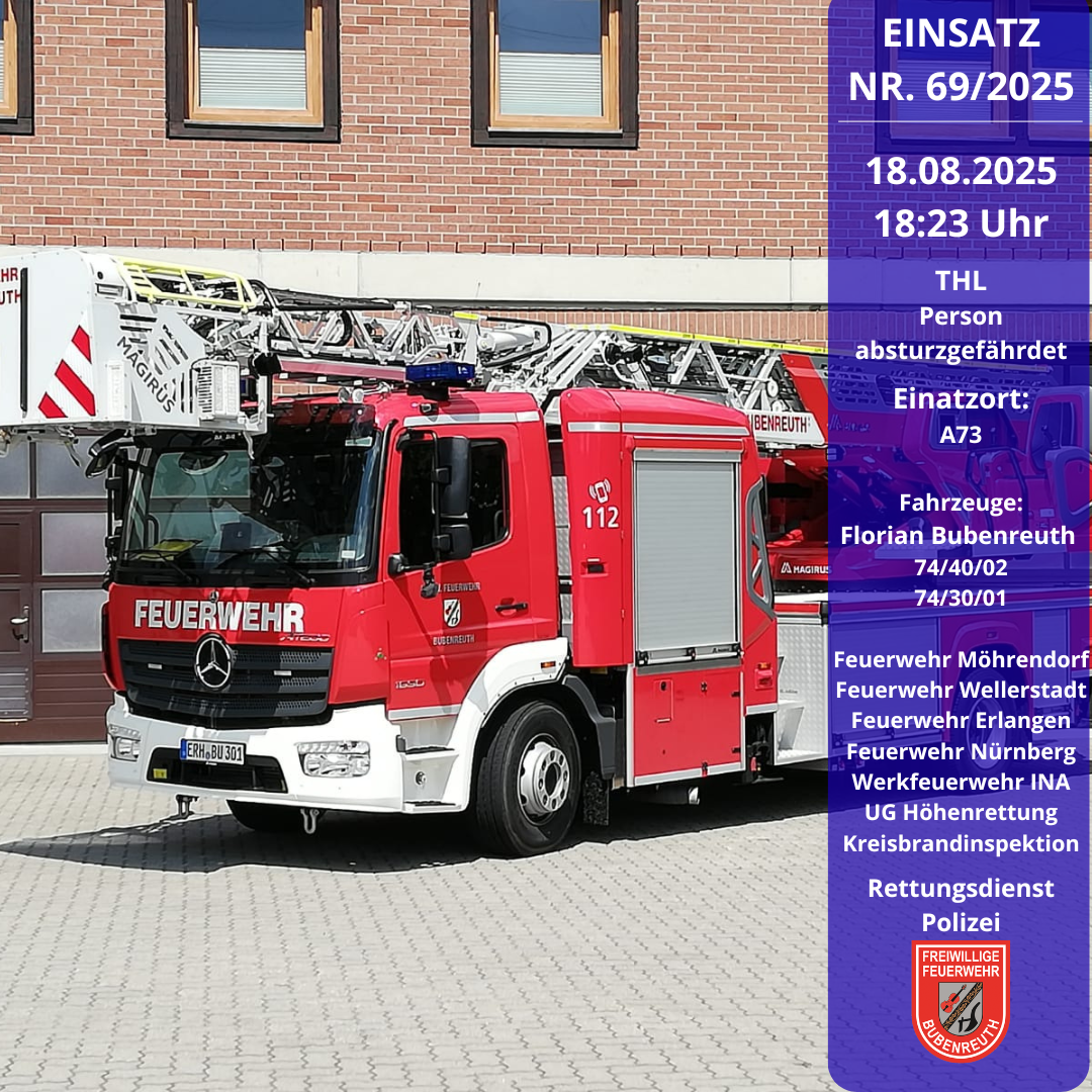 +++ 18.08.2025 / 18:23 Uhr --- Einsatz Nr. 069/2025 --- THL- Person absturzgefährdet --- A73 - AS Möhrendorf --- Einsatz für HLF20 + DLK+++