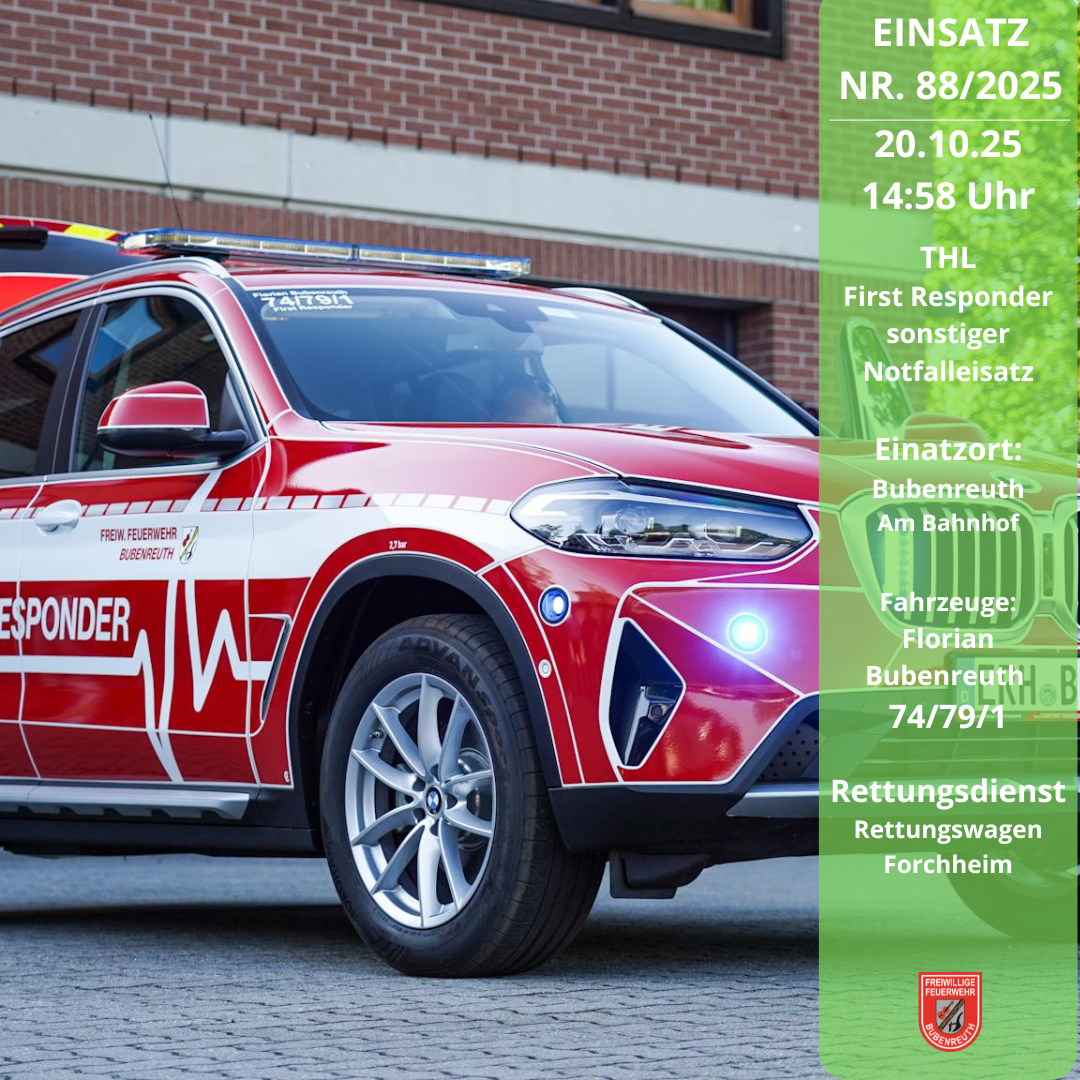 +++ 20.10.2025 / 14:58 Uhr --- Einsatz Nr. 088/2025 --- THL - First Responder / sonstiger Nofalleinsatz --- Bubenreuth - Am Bahnhof --- Einsatz für den First Responder +++