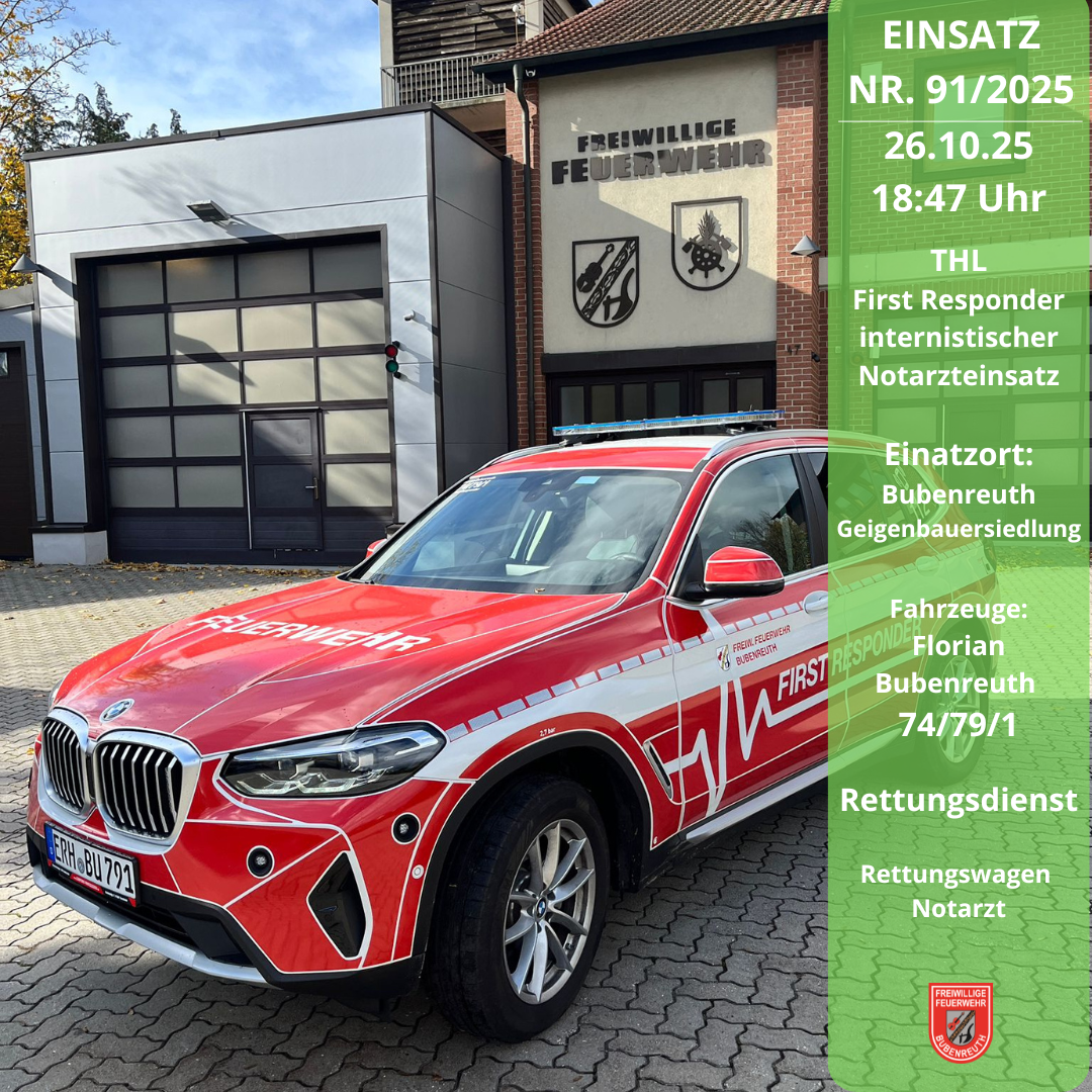 Die Leitstelle Nürnberg alarmierte am 26.10.2025 um 18:47 Uhr die Kollegen des First Responder Bubenreuth zu einem internistischen Notarzteinsatz in die Geigenbauersiedlung. Bis zum Eintreffen des Rettungsdienstpersonals wurde der Patient durch den First Responder versorgt und betreut. Im Anschluss unterstützten wir die weiteren Maßnahmen. Nach der Stabilisierung des Patienten wurde dieser mit dem Rettungswagen in ein nahegelegenes Krankenhaus zur weiteren Behandlung verbracht. Wir wünschen alles Gute und schnelle Genesung.