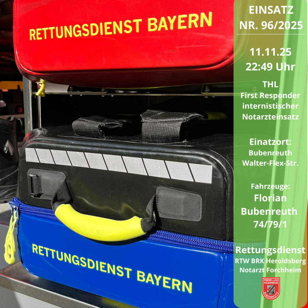 Die Leitstelle Nürnberg alarmierte am 11.11.2025 um 22:49 Uhr die Kollegen des First Responder Bubenreuth gemeinsam mit einem Rettungswagen und dem Notarzt zu einem internistischen Notarzteinsatz in die Walter-Flex-Str. nach Bubenreuth. Bis zum Eintreffen des Rettungsdienstpersonals wurde der Patient durch den First Responder versorgt und betreut. Im Anschluss unterstützten wir die weiteren Maßnahmen. Nach der Stabilisierung des Patienten wurde dieser mit dem Rettungswagen in ein nahegelegenes Krankenhaus zur weiteren Behandlung verbracht. Wir wünschen alles Gute und schnelle Genesung.