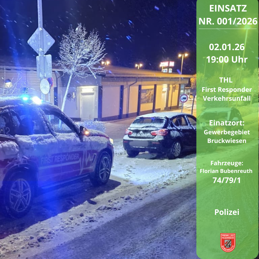 +++ 02.01.2026 / 19:00 Uhr --- Einsatz Nr. 001/2026 --- THL - First Responder / Verkehrsunfall --- Bubenreuth - Gewerbegebiet Bruckwiesen --- Einsatz für den First Responder +++