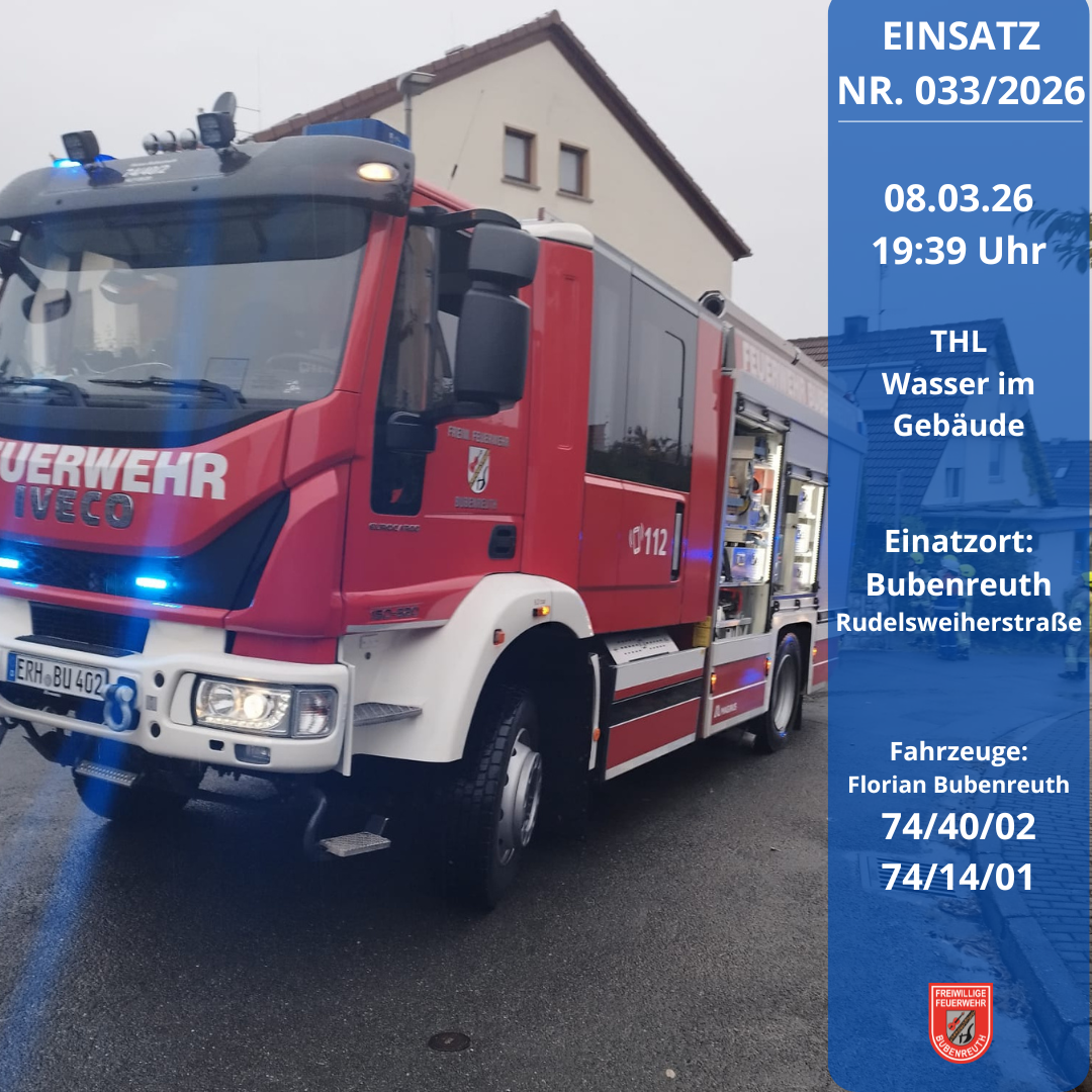 Bubenreuth – Am Sonntagabend, den 08. März 2026, wurde die Feuerwehr Bubenreuth um 19:39 Uhr von der Integrierten Leitstelle Nürnberg zu einem Wasserschaden in die Rudelsweiherstraße alarmiert.