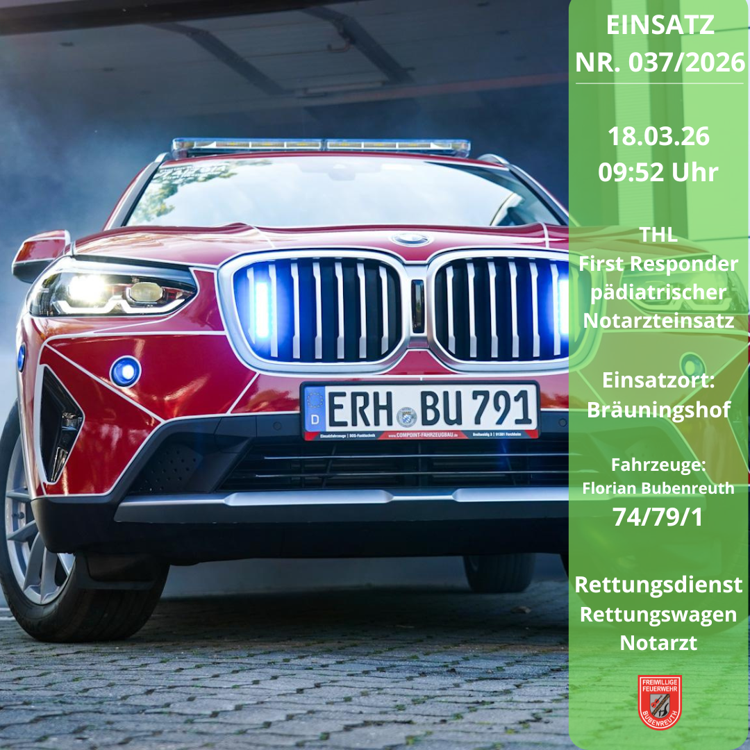 Die Leitstelle Nürnberg alarmierte am 18.03.2026 um 09:52 Uhr die Kollegen des First Responder Bubenreuth gemeinsam mit einem Rettungswagen zu einem pädiatrischen Notarzteinsatz nach Bräuningshof. Bis zum Eintreffen des Rettungsdienstpersonals wurde der kleine Patient durch den First Responder versorgt und betreut. Im Anschluss unterstützten wir die weiteren Maßnahmen. Durch den Rettungsdienst wurde der Patient in ein nahegelegenes Krankenhaus transportiert. Wir wünschen gute Besserung.