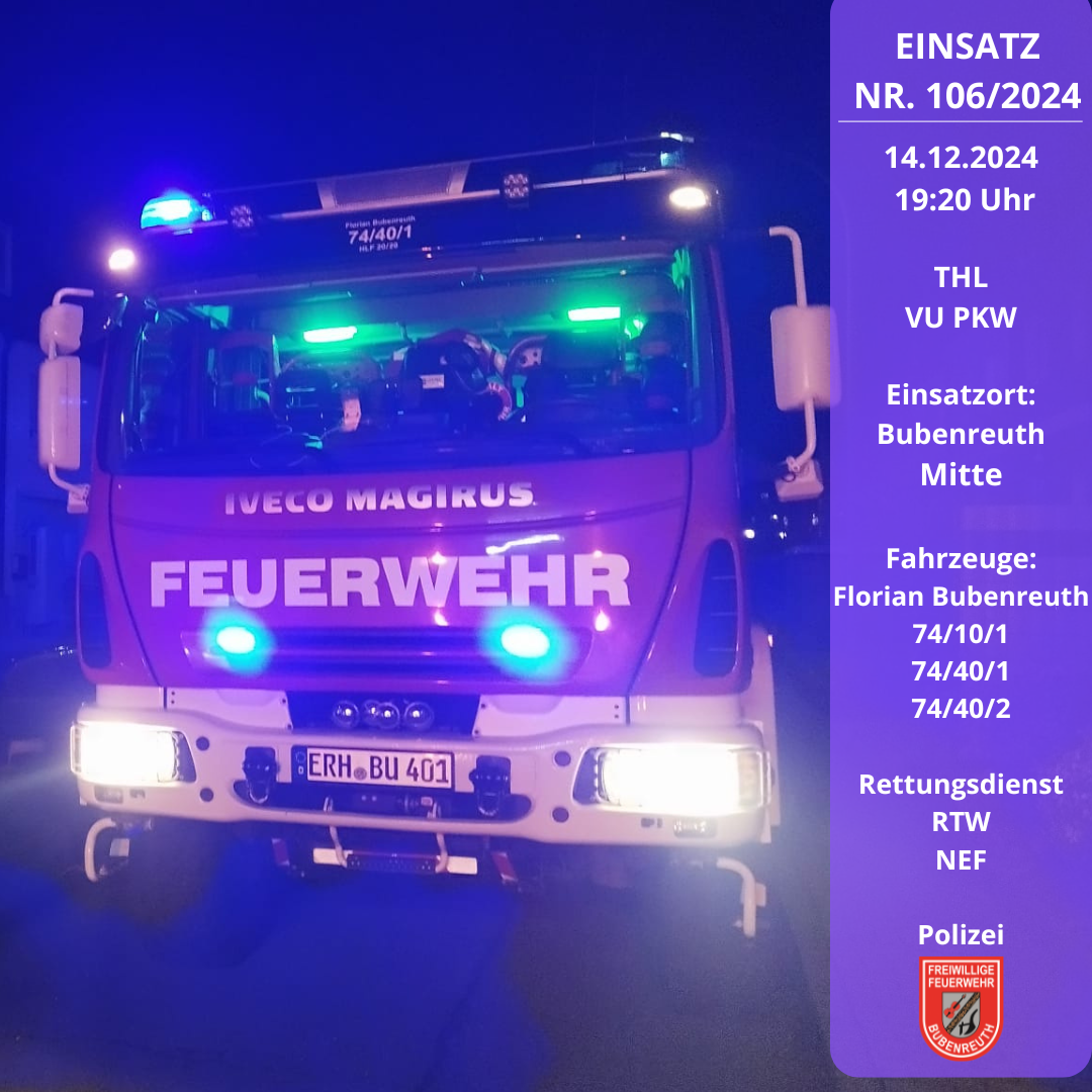 +++ 14.12.2024 / 19:20 Uhr --- Einsatz Nr. 106/2024 --- THL - VU PKW --- Bubenreuth / Mitte --- Einsatz für das HLF1 + HLF2 +++