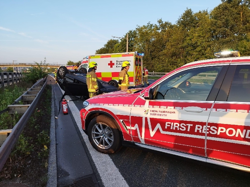 Laut Erstmeldung hatte sich ein PKW überschlagen und lag auf dem Dach – die Fahrerin sei eingeklemmt. Die beiden First Responder aus Bubenreuth trafen gemeinsam mit der Polizei als erste an der Unfallstelle ein und verschafften sich einen Überblick über die Lage.