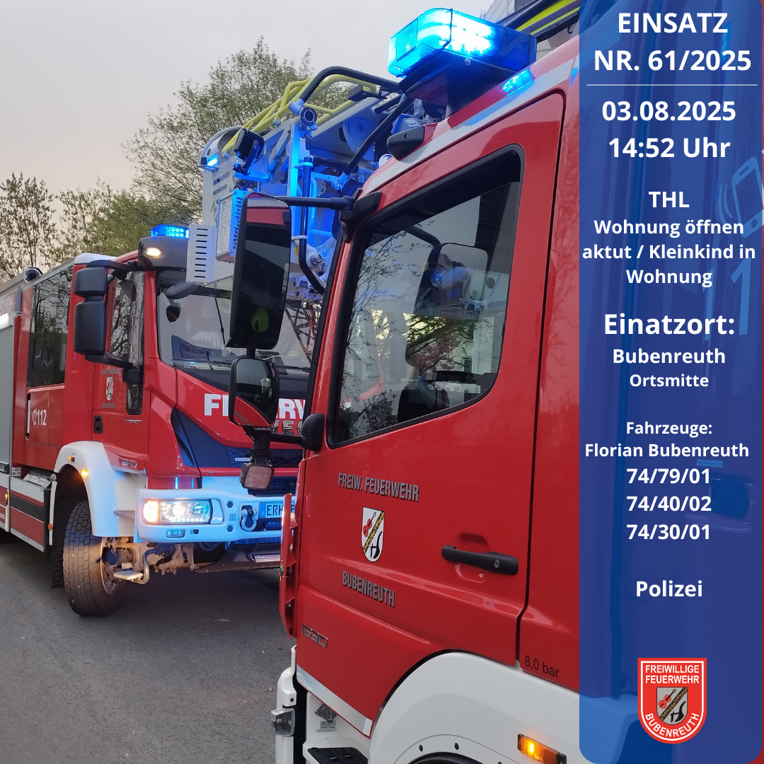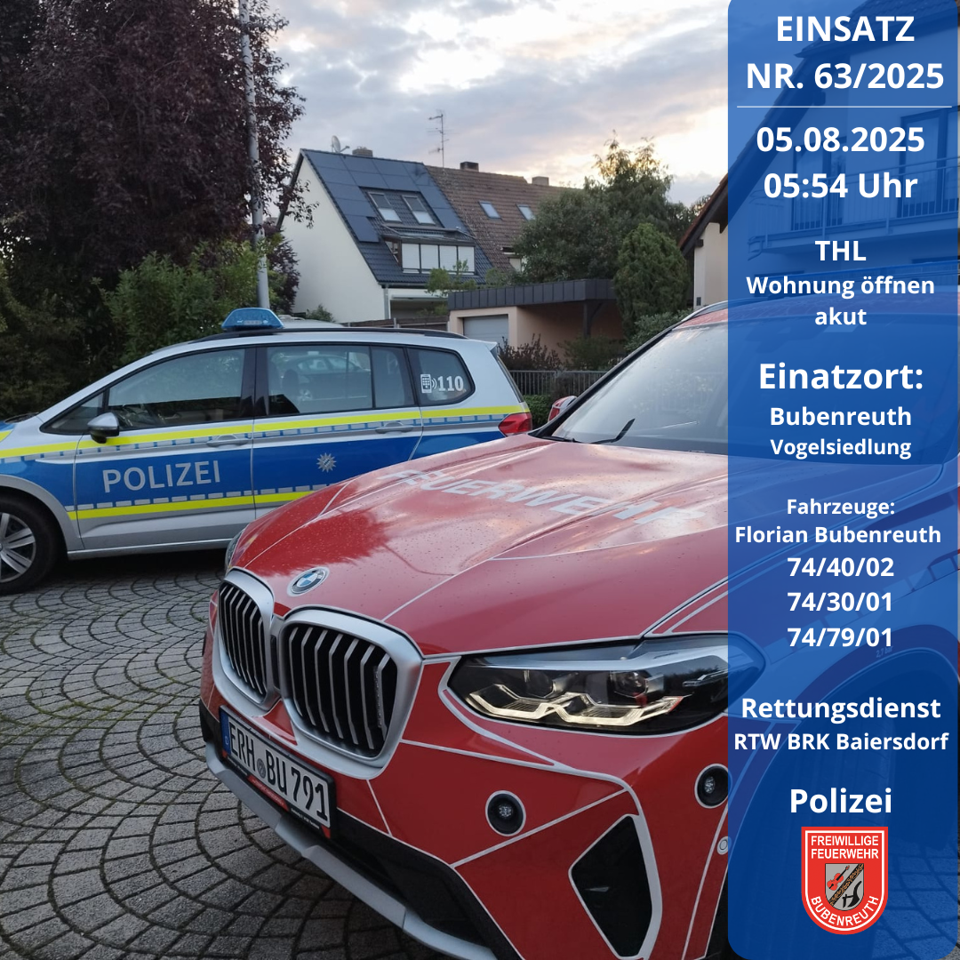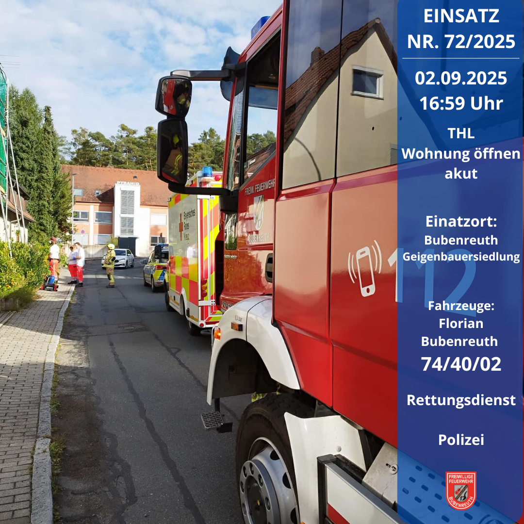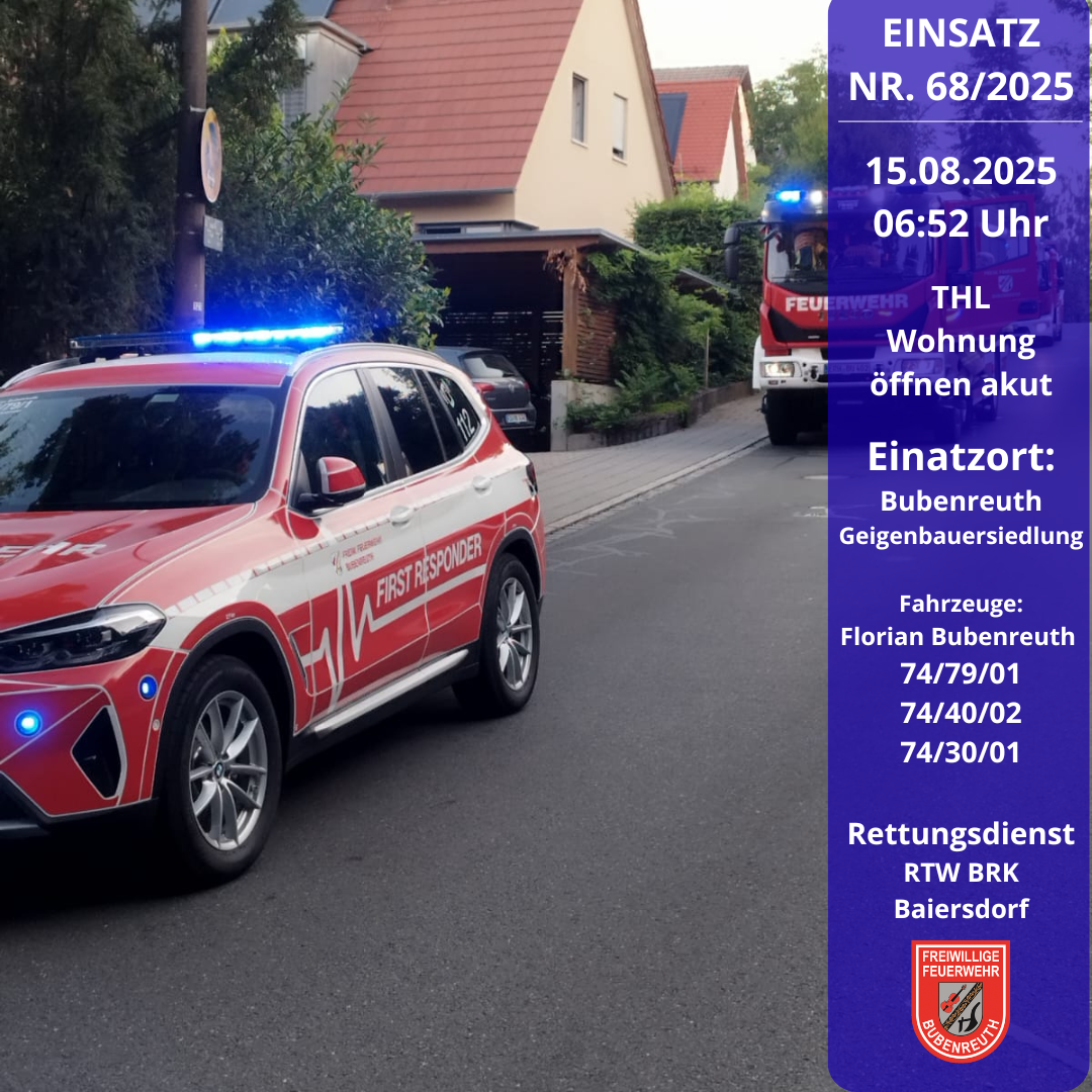 Am Dienstagabend um 16:59 Uhr wurde die Freiwillige Feuerwehr Bubenreuth gemeinsam mit Polizei und Rettungsdienst von der Integrierten Leitstelle (ILS) Nürnberg zu einer dringenden Wohnungsöffnung in die Geigenbauersiedlung alarmiert. Grund für den Einsatz war der Verdacht auf einen möglichen Unglücksfall in einer Wohnung.