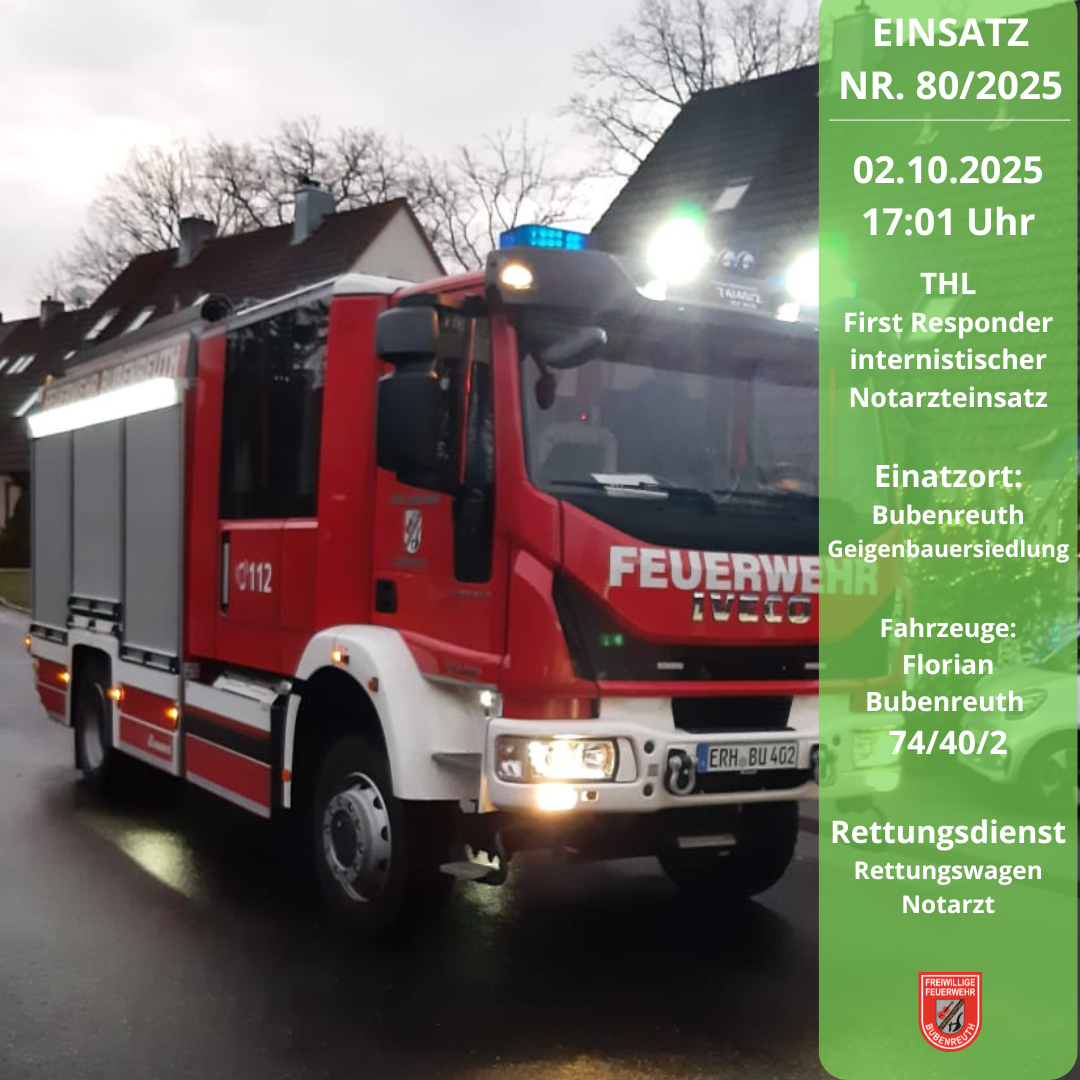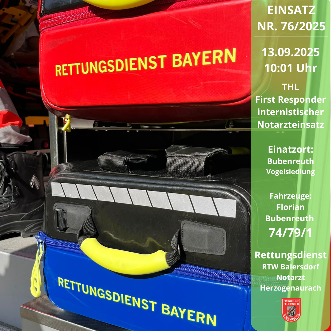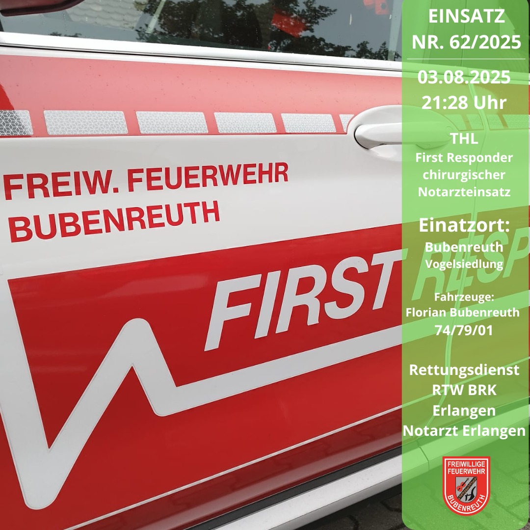 Die Leitstelle Nürnberg alarmierte am 02.10.2025 um 17:01 Uhr die Kollegen der Feuerwehr Bubenreuth zu einem internistischen Notarzteinsatz in die Vogelsiedlung da im näheren Umkreis kein Rettungsmittel zur Verfügung stand. Bis zum Eintreffen des Rettungsdienstpersonals wurde der Patient von den Feuerwehrkameraden versorgt und betreut. Im Anschluss unterstützten wir die weiteren Maßnahmen. Nach der Stabilisierung des Patienten wurde dieser mit dem Rettungswagen in ein nahegelegenes Krankenhaus zur weiteren Behandlung gebracht. Wir wünschen alles Gute und schnelle Genesung.