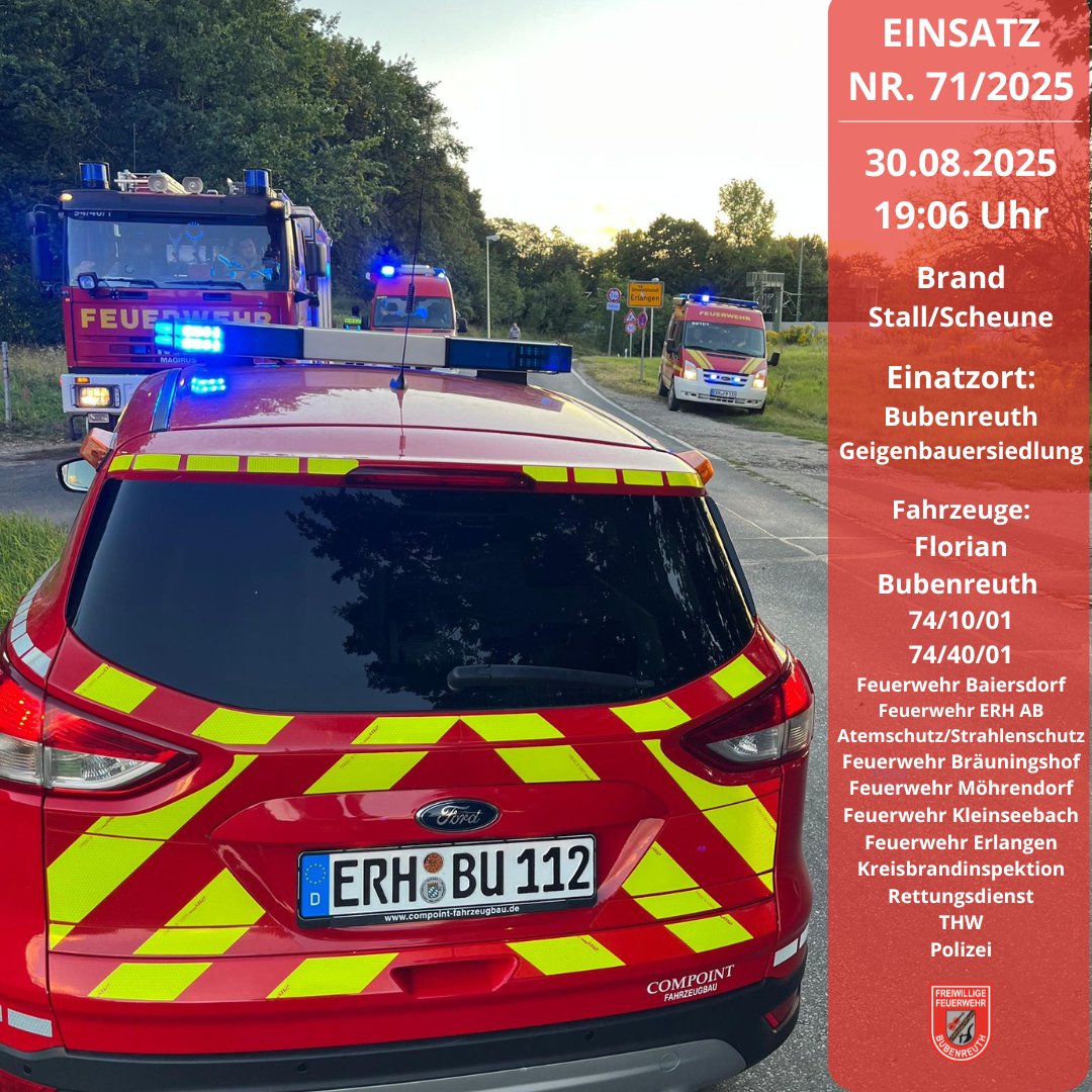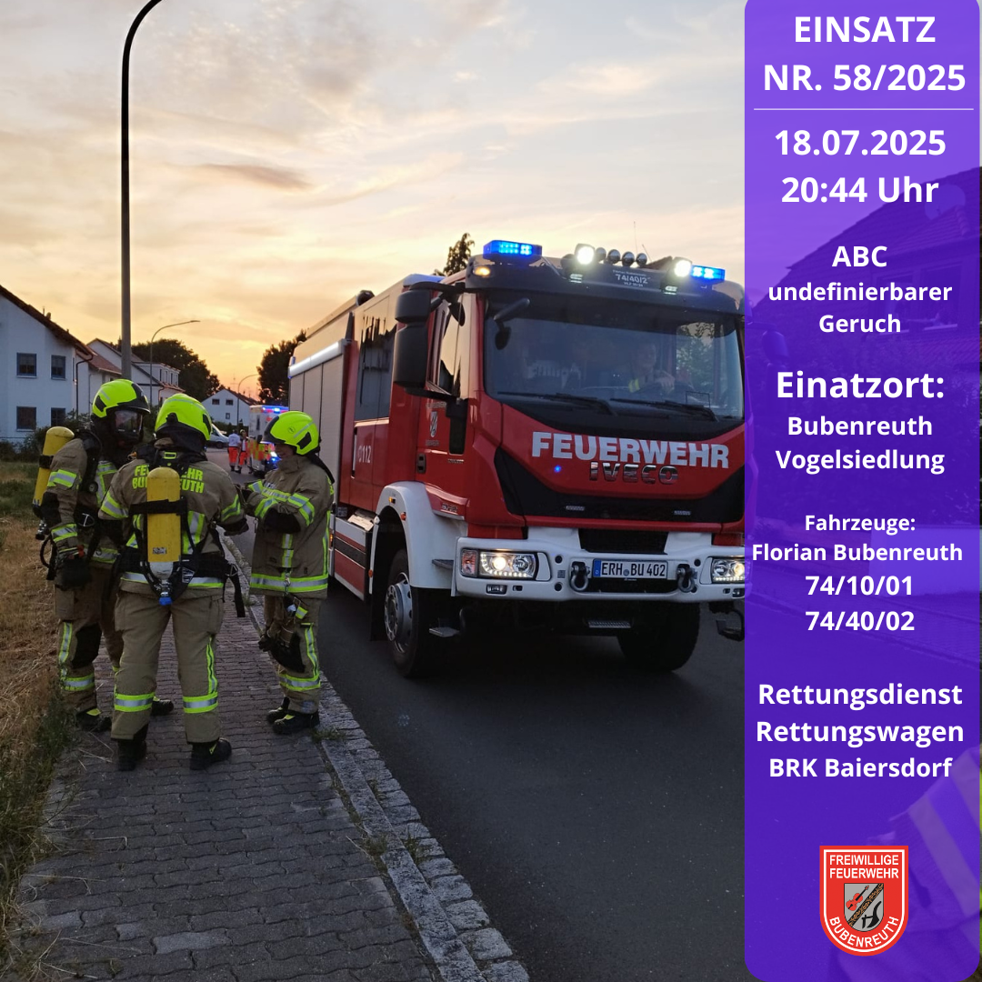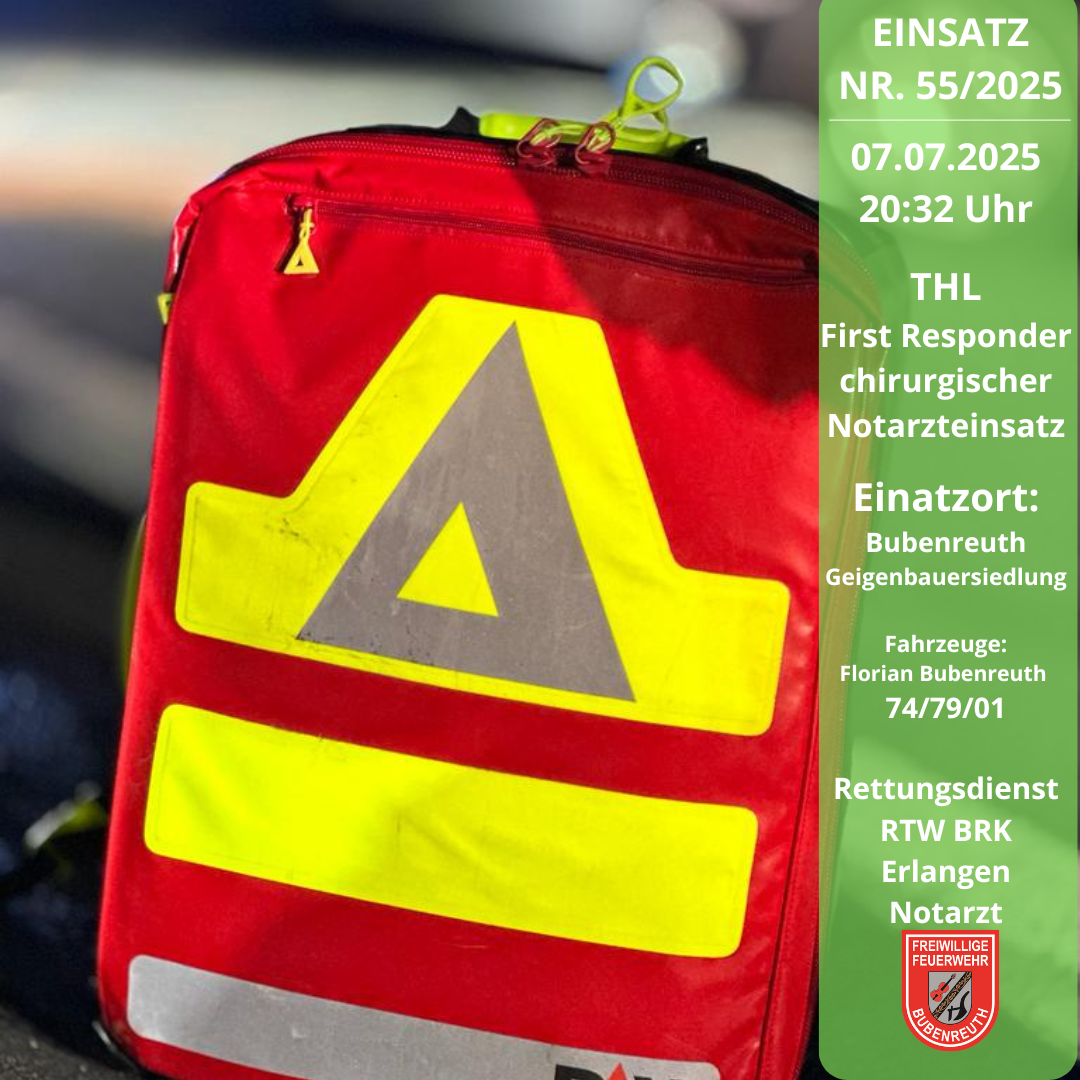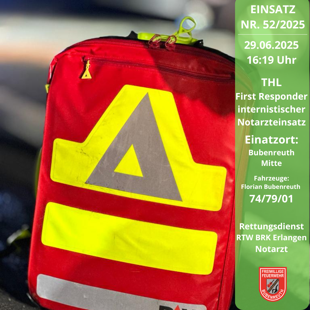 Die Leitstelle Nürnberg alarmierte am 02.10.2025 um 17:01 Uhr die Kollegen der Feuerwehr Bubenreuth zu einem internistischen Notarzteinsatz in die Vogelsiedlung da im näheren Umkreis kein Rettungsmittel zur Verfügung stand. Bis zum Eintreffen des Rettungsdienstpersonals wurde der Patient von den Feuerwehrkameraden versorgt und betreut. Im Anschluss unterstützten wir die weiteren Maßnahmen. Nach der Stabilisierung des Patienten wurde dieser mit dem Rettungswagen in ein nahegelegenes Krankenhaus zur weiteren Behandlung gebracht. Wir wünschen alles Gute und schnelle Genesung.