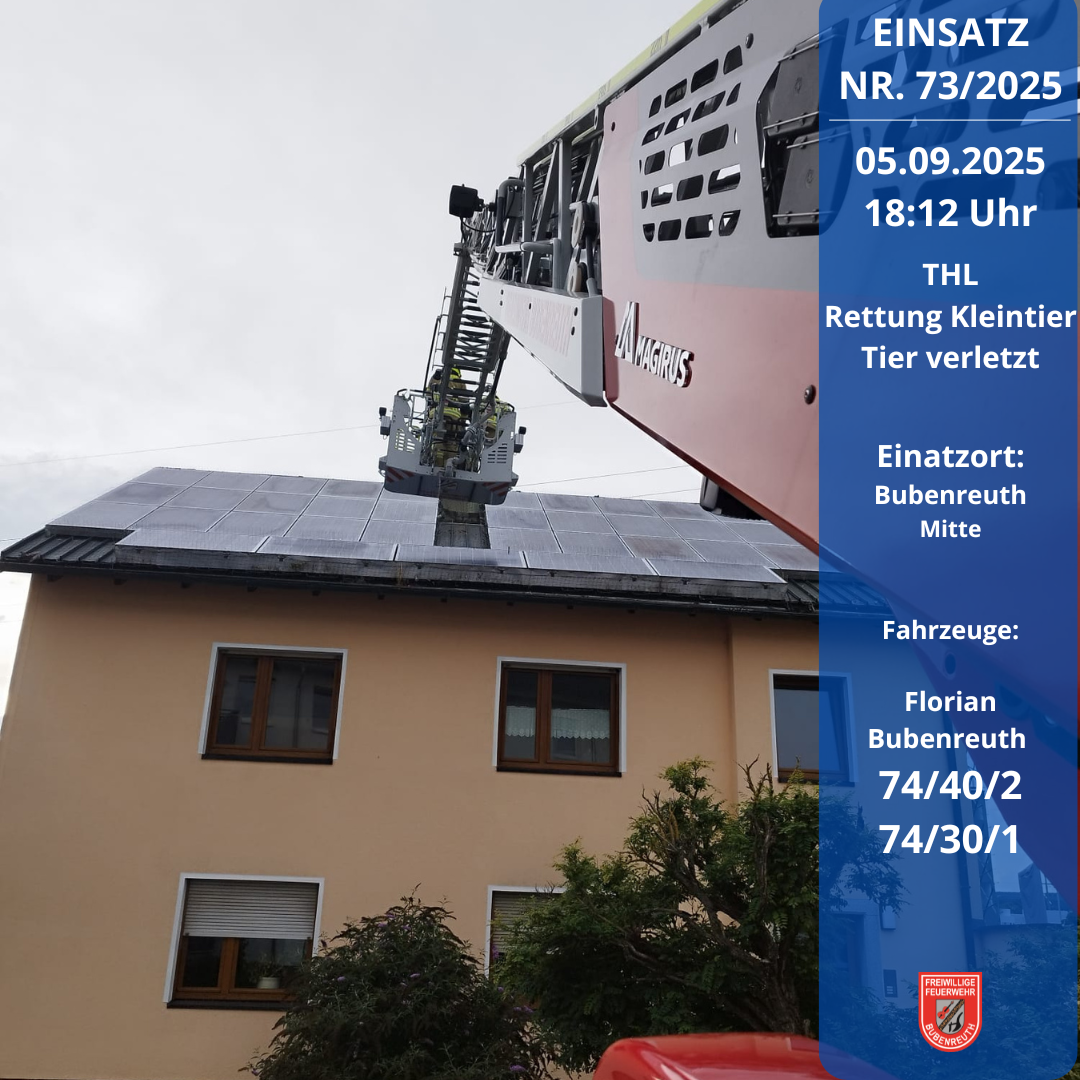 +++ 05.09.2025 / 18:12 Uhr --- Einsatz Nr. 073/2025 --- THL Kleintierrettung - verletztes Tier --- Bubenreuth - Mitte --- Einsatz für das HLF20 + Drehleiter +++