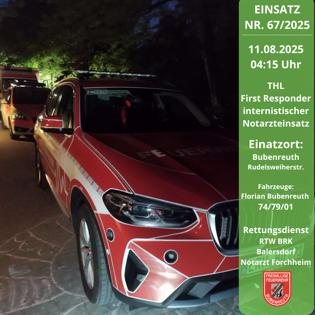 Die Leitstelle Nürnberg alarmierte am 10.09.2025 um 20:13 Uhr erneut die Kollegen des First Responder Bubenreuth zu einem internistischen Notarzteinsatz in die Geigenbauersiedlung. Bis zum Eintreffen des Rettungsdienstpersonals wurde der Patient versorgt und betreut. Im Anschluss unterstützten wir die weiteren Maßnahmen. Nach der Stabilisierung des Patienten wurde dieser mit dem Rettungswagen in ein nahegelegenes Krankenhaus zur weiteren Behandlung gebracht Wir alles Gute und schnelle Genesung.
