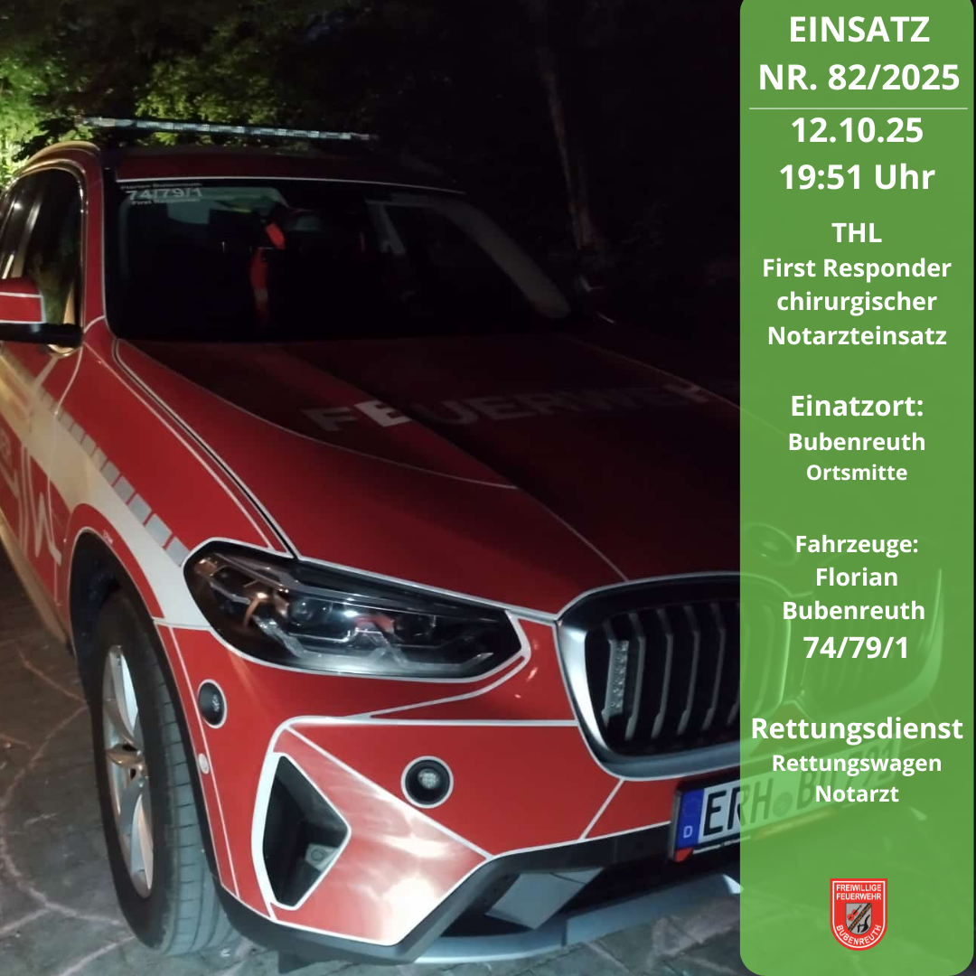 +++ 12.10.2025 / 18:51 Uhr --- Einsatz Nr. 082/2025 --- THL - First Responder / chirurgischer Notarzteinsatz --- Bubenreuth - Ortsmitte --- Einsatz für den First Responder +++