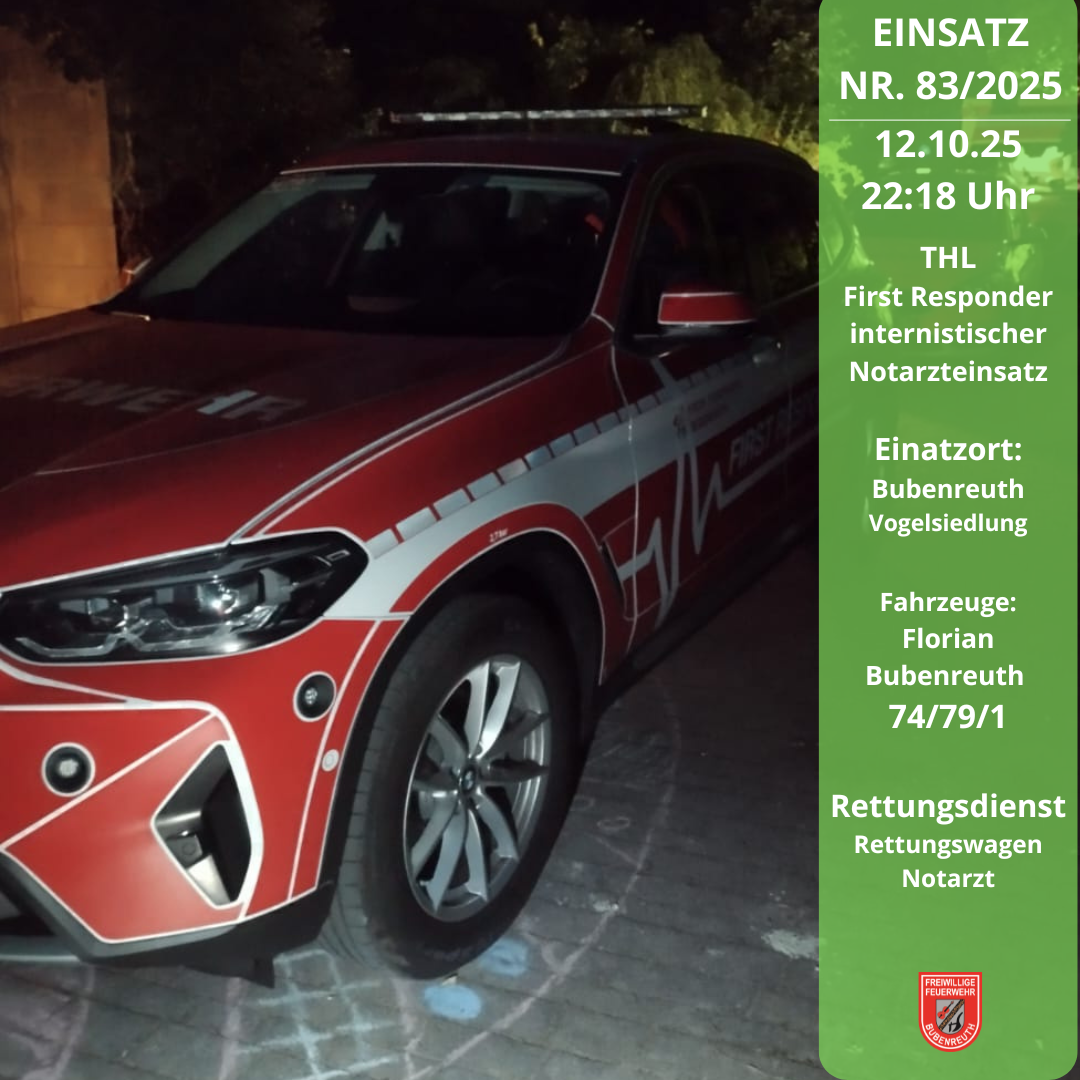 +++ 12.10.2025 / 22:18 Uhr --- Einsatz Nr. 083/2025 --- THL - First Responder / internistischer Notarzteinsatz --- Bubenreuth - Vogelsiedlung --- Einsatz für den First Responder +++