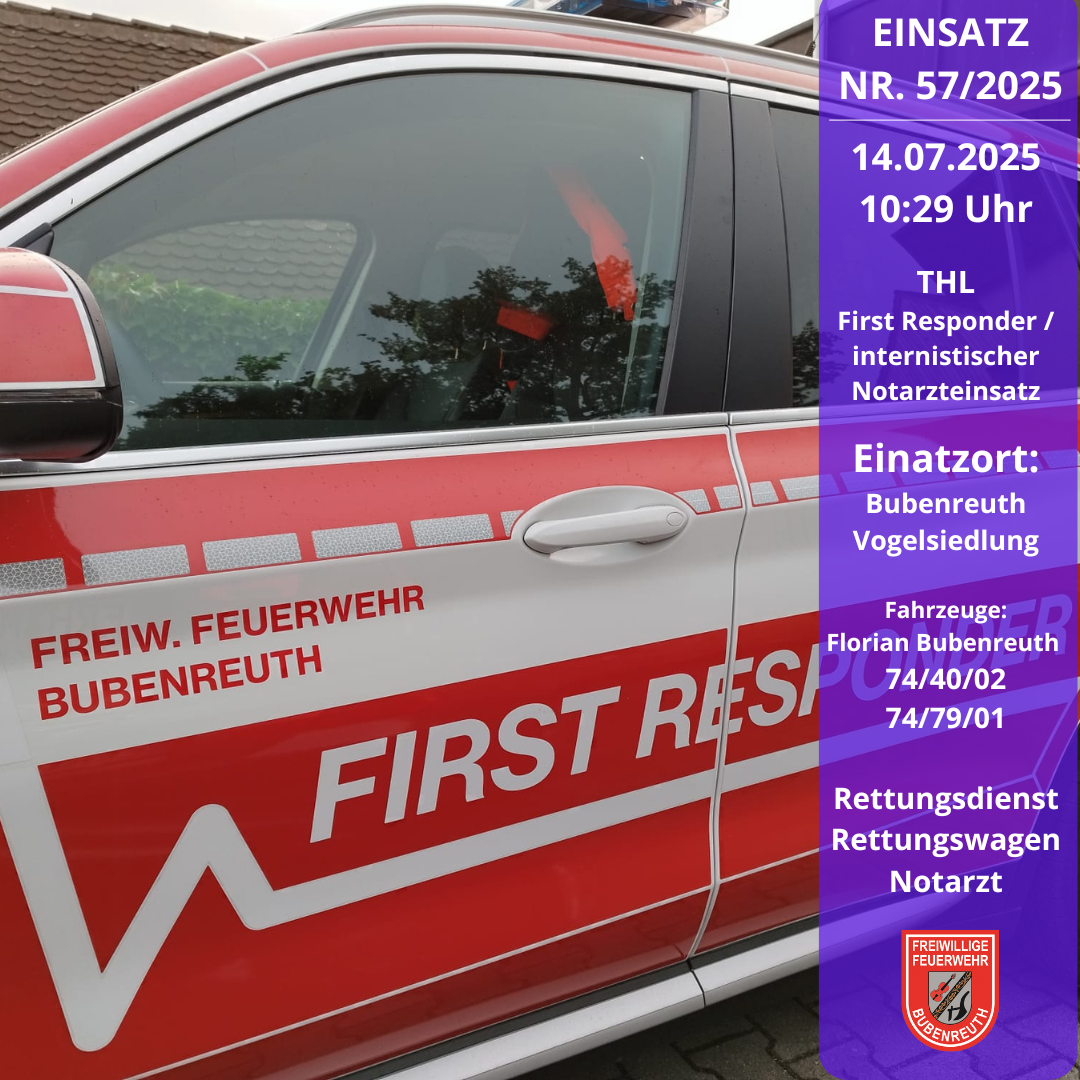 Die Leitstelle Nürnberg alarmierte am 12.09.2025 um 10:01 Uhr die Kollegen des First Responder Bubenreuth zu einem internistischen Notarzteinsatz in die Vogelsiedlung. Bis zum Eintreffen des Rettungsdienstpersonals wurde der Patient versorgt und betreut. Im Anschluss unterstützten wir die weiteren Maßnahmen. Nach der Stabilisierung des Patienten wurde dieser mit dem Rettungswagen in ein nahegelegenes Krankenhaus zur weiteren Behandlung gebracht. Wir wünschen alles Gute und schnelle Genesung.