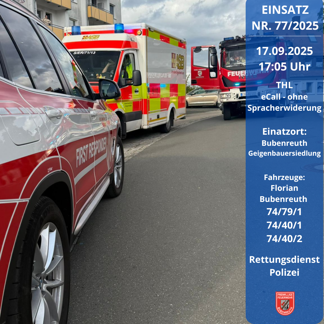 +++ 17.09.2025 / 17:05 Uhr --- Einsatz Nr. 077/2025 --- THL - eCall - ohne Spracherwiderung --- Bubenreuth - Geigenbauersiedlung --- Einsatz für den First Responder + HLF20 +++