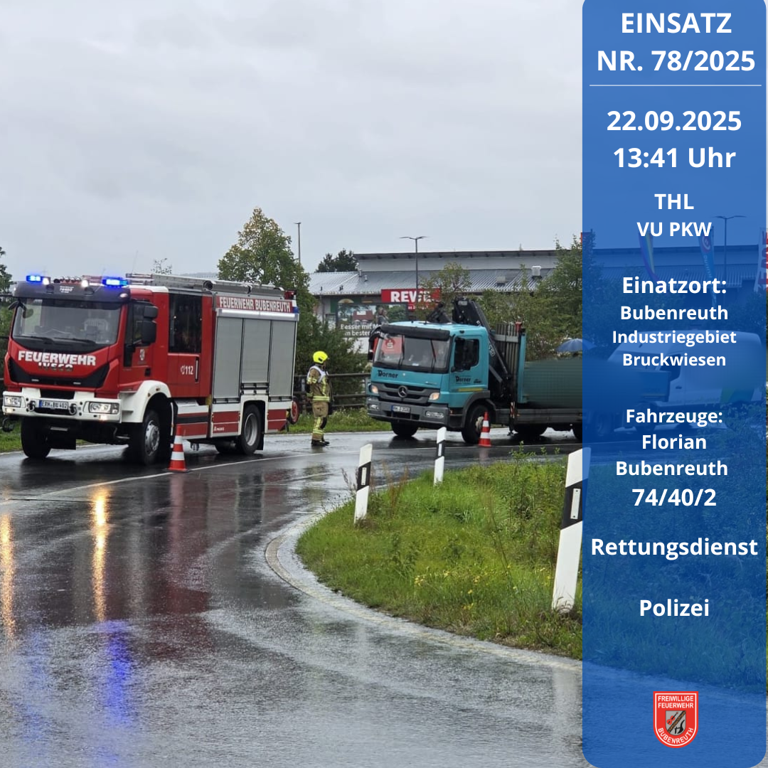 Bubenreuth, 22. September 2025 – Am Montagmittag wurden die Einsatzkräfte der Feuerwehr Bubenreuth um 13:41 Uhr durch die Integrierte Leitstelle Nürnberg zu einem Verkehrsunfall auf der Kreisstraße im Industriegebiet Bruckwiesen alarmiert. Auch Polizei und Rettungsdienst waren im Einsatz.
