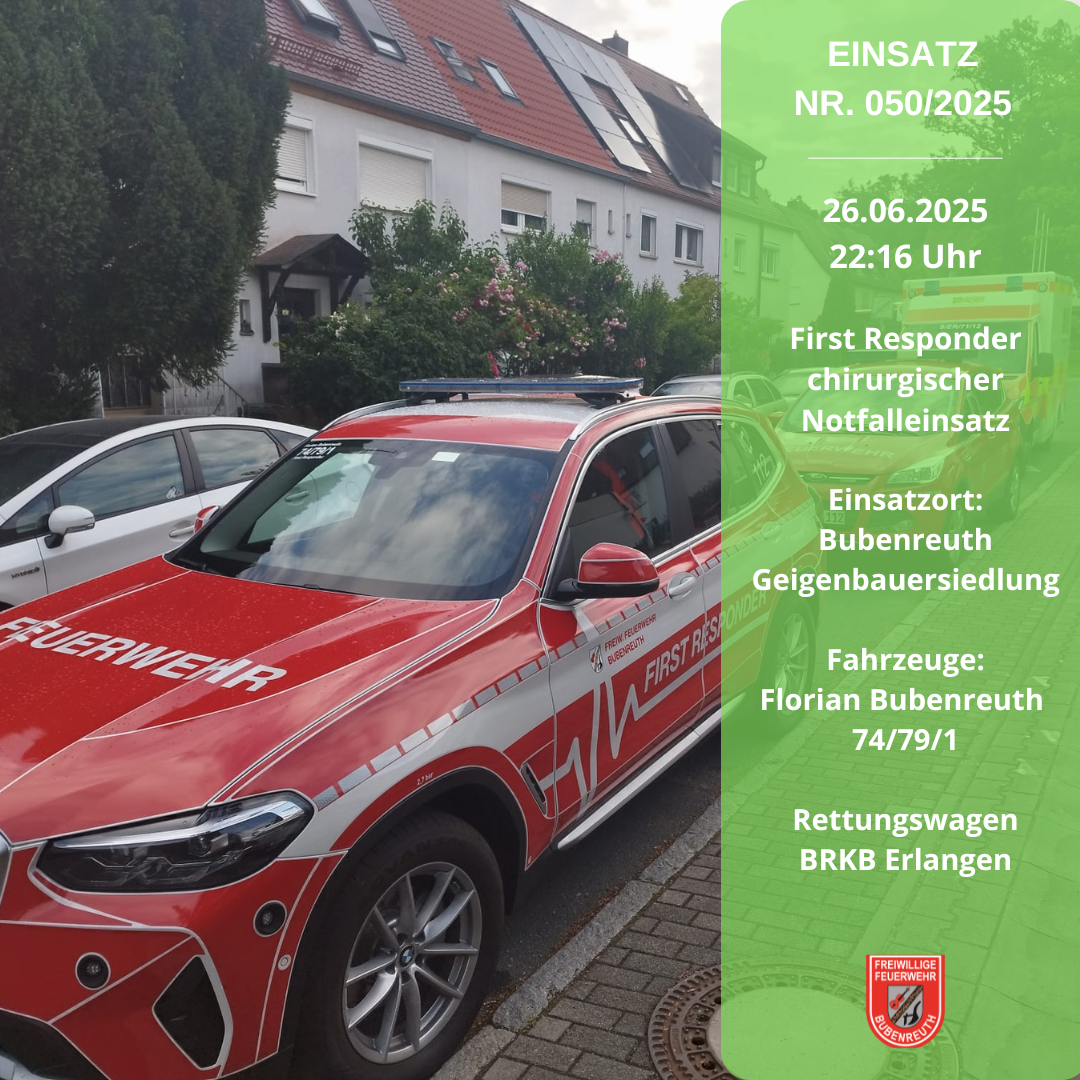 Die Leitstelle Nürnberg alarmierte am 04.10.2025 um 15:56 Uhr die Kollegen des First Responder Bubenreuth zu einem chirurgischen Notarzteinsatz in die Kurt-Albert-Str. in Bubenreuth. Bis zum Eintreffen des Rettungsdienstpersonals wurde der Patient durch den First Responder versorgt und betreut. Im Anschluss unterstützten wir die weiteren Maßnahmen. Nach der Stabilisierung des Patienten wurde diese mit dem Rettungswagen in ein nahegelegenes Krankenhaus zur weiteren Behandlung verbracht. Wir wünschen alles Gute und schnelle Genesung.
