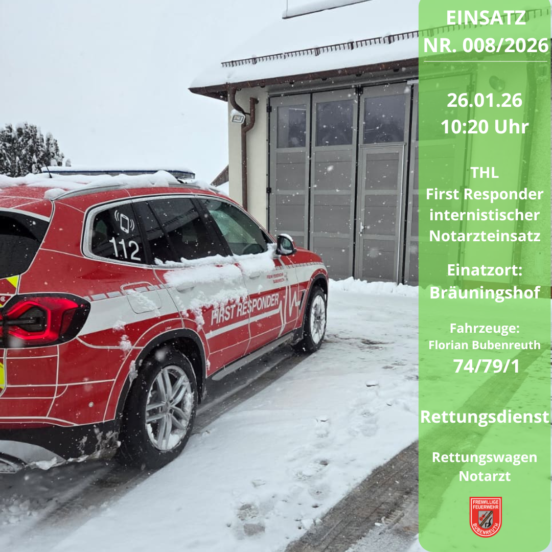 Die Leitstelle Nürnberg alarmierte am 26.01.2026 um 10:20 Uhr die Kollegen des First Responder Bubenreuth gemeinsam mit einem Rettungswagen und dem Notarzt zu einem internistischen Notarzteinsatz nach Bräuningshof. Bis zum Eintreffen des Rettungsdienstpersonals wurde die Patientin durch den First Responder versorgt und betreut. Im Anschluss unterstützten wir die weiteren Maßnahmen. Wir wünschen gute Besserung.