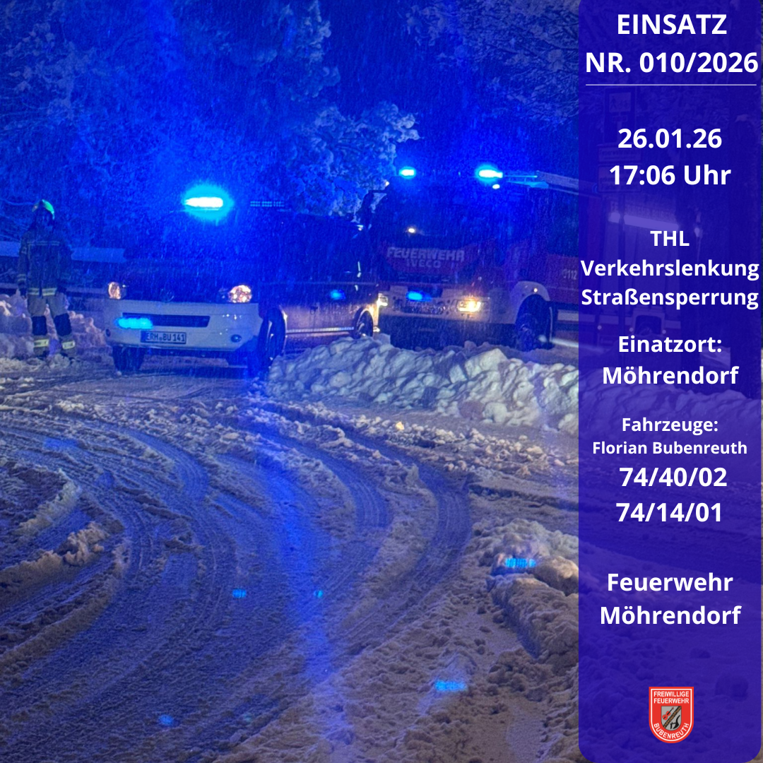 Die Leitstelle Nürnberg alarmierte am 26.01.2026 um 17:06 Uhr die Kollegen der Feuerwehr Bubenreuth nach Möhrendorf zur Verkehrsregelung. Die Fahrzeuge fuhren den Bereitstellungsraum an, mussten jedoch nicht tätig werden.