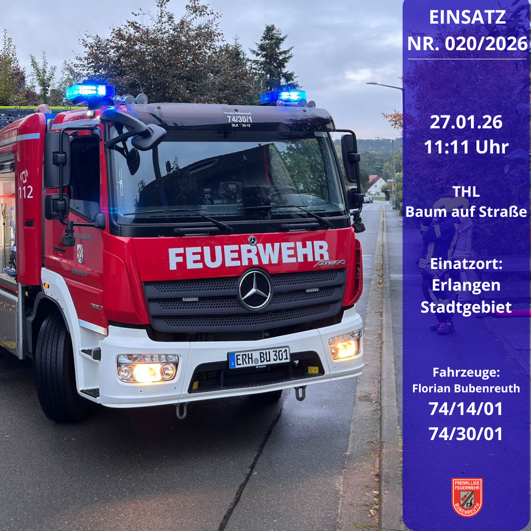 Die Leitstelle Nürnberg alarmierte am 27.01.2026 um 11:11 Uhr die Kameraden der Feuerwehr Bubenreuth zu einer Einsatzstelle im Stadtgebiet Erlangen. Aufgrund der enormen Schneemassen drohte ein Baum auf die Fahrbahn zu stürzen. Der Baum wurden mit Hilfe der Drehleiter und Kettensägen beseitigt.