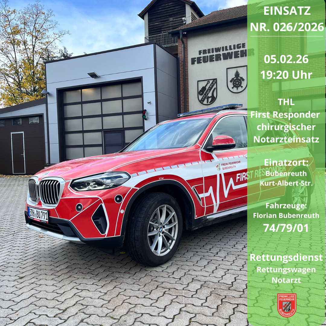 Die Leitstelle Nürnberg alarmierte am 05.01.2026 um 19:20 Uhr die Kollegen des First Responder Bubenreuth gemeinsam mit einem Rettungswagen und dem Notarzt zu einem chirurgischen Notarzteinsatz nach Bubenreuth in die Kurt-Albert-Straße. Bis zum Eintreffen des Rettungsdienstpersonals wurde der Patient durch den First Responder versorgt und betreut. Im Anschluss unterstützten wir die weiteren Maßnahmen. Durch den Rettungsdienst wurde der Patient in ein nahegelegenes Krankenhaus transportiert. Wir wünschen gute Besserung.