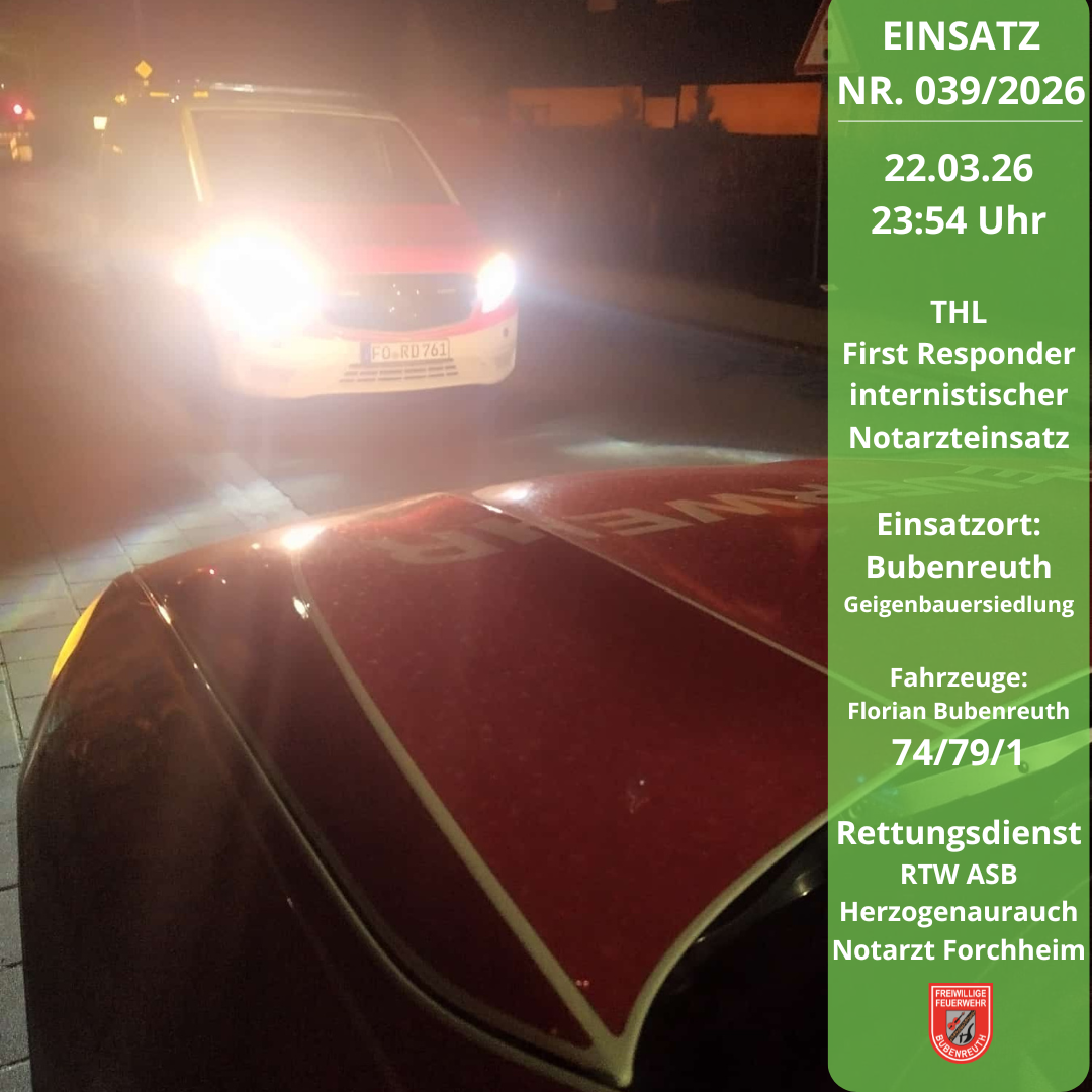 Die Leitstelle Nürnberg alarmierte am 22.03.2026 um 23:54 Uhr die Kollegen des First Responder Bubenreuth gemeinsam mit einem Rettungswagen und den Notarzt zu einem internistischen Notarzteinsatz in die Geigenbauersiedlung. Bis zum Eintreffen des Rettungsdienstpersonals wurde die Patientin durch den First Responder versorgt und betreut. Im Anschluss unterstützten wir die weiteren Maßnahmen. Durch den Rettungsdienst wurde die Patientin in ein nahegelegenes Krankenhaus transportiert. Wir wünschen gute Besserung.