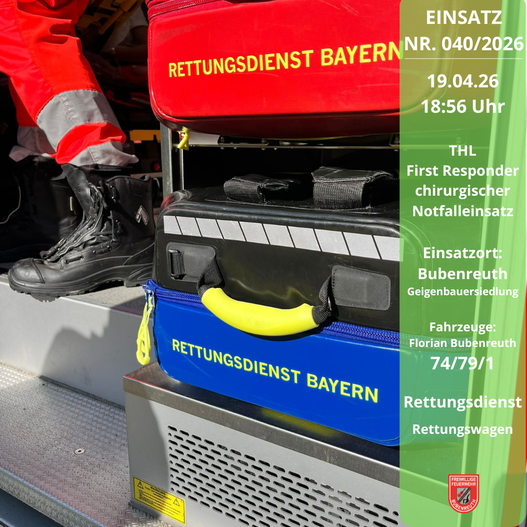 Die Leitstelle Nürnberg alarmierte am 19.04.2026 um 18:56 Uhr die Kollegen des First Responder Bubenreuth gemeinsam mit einem Rettungswagen zu einem chirurgischen Notfalleinsatz in die Geigenbauersiedlung. Bis zum Eintreffen des Rettungsdienstpersonals wurde der Patient durch den First Responder versorgt und betreut. Im Anschluss unterstützten wir die weiteren Maßnahmen. Durch den Rettungsdienst wurde der Patient in ein nahegelegenes Krankenhaus transportiert. Wir wünschen gute Besserung.