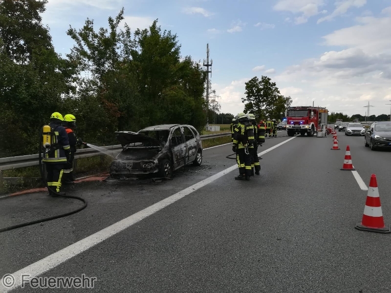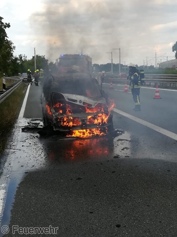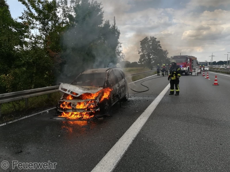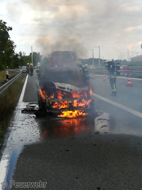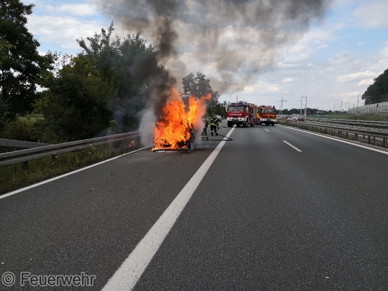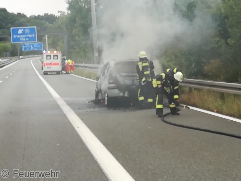 Die ILS Nürnberg alarmierte die Feuerwehren Bubenreuth, Baiersdorf und Möhrendorf sowie den Rettungsdienst auf die BAB 73 Auffahrt Möhrendorf in Richtung Erlangen zu einem PKW Brand. Schon auf der Anfahrt war eine starke Rauchentwicklung ersichtlich. Bei Ankunft stand der PKW bereits in Vollbrand. Der Angriffstrupp ging unter schwerem Atemschutz mit dem Schnellangriff zur Brandbekämpfung vor. Der Wassertrupp übernahm die Verkehrsabsicherung. Die nachrückenden Kräfte aus Möhrendorf übernahmen mit dem 2. Angriffstrupp ebenfalls die Brandbekämpfung. Die Feuerwehr Baiersdorf sicherte mit Hilfe des Verkehrssicherungsanhängers die Einsatzstelle ab. Der PKW Fahrer sowie sein Beifahrer konnten rechtzeitig das Fahrzeug verlassen. Der Rettungsdienst übernahm die Absicherung für die Einsatzkräfte.