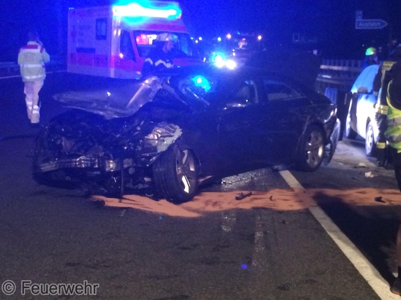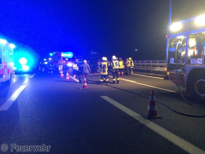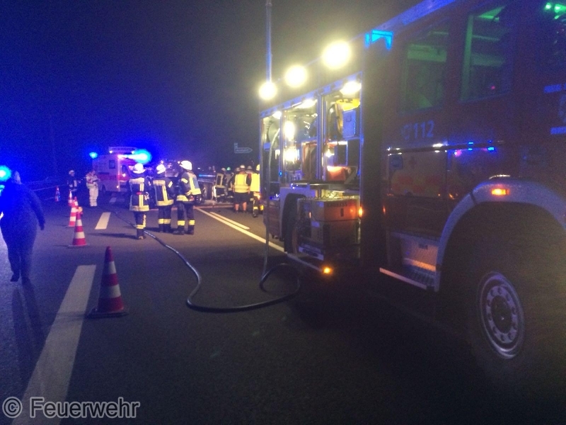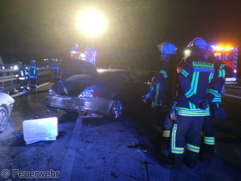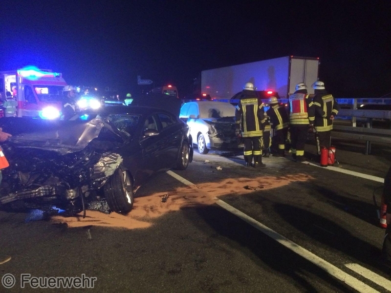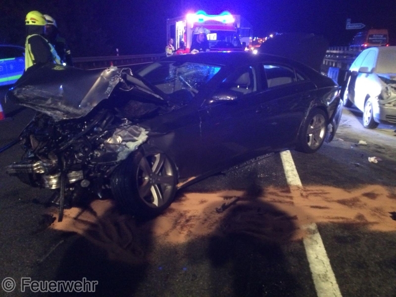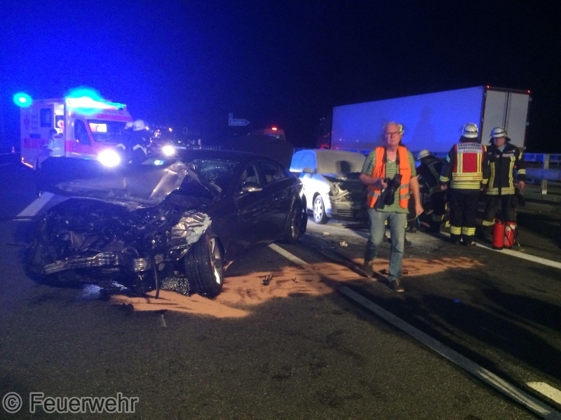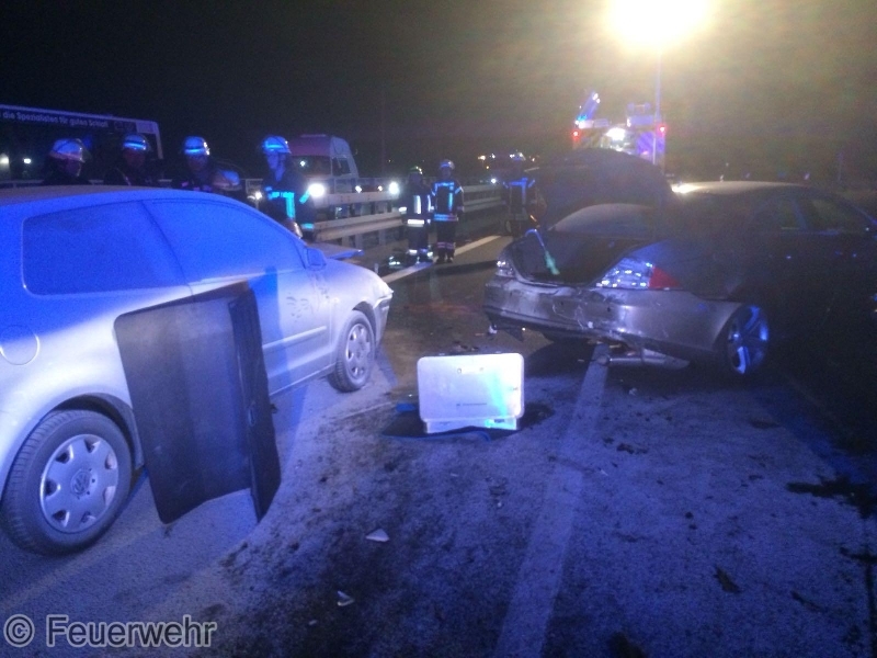 Am Freitagabend, 31.08., kam es gegen 20:25 Uhr zu einem heftigen Verkehrsunfall zwischen 2 PKW und einem LKW auf der BAB73 in Fahrtrichtung Nürnberg in Höhe der Anschlussstelle Möhrendorf. Dabei geriet einer der PKW in Brand, der jedoch durch den reaktionsschnellen Einsatz des Fahrers eines nachfolgenden Lastzugs mit zwei Pulverlöschern erfolgreich bekämpft werden konnte.Beim Zusammenprall wurde ein PKW-Lenker verletzt und musste nach der notärztlicher Erstversorgung in ein Krankenhaus transportiert werden. Auch eine weitere, schwangere Unfallbeteiligte wurde vom Rettungsdienst vorsorglich in eine Klinik gebracht. Die alarmierten Feuerwehren aus Möhrendorf, Bubenreuth und Baiersdorf sperrten die Autobahn während der Erstversorgung der Verletzten komplett in Fahrtrichtung Süden, danach konnte der Verkehr über die Einfädelspur an der Unfallstelle vorbeigeleitet werden. Daneben wurde die Einsatzstelle großflächig mit mehreren Lichtmasten ausgeleuchtet, der Brandschutz sichergestellt und auslaufende Betriebsstoffe gebunden. Auch die Gegenfahrbahn musste durch die Polizei kurzzeitig komplett gesperrt werden, um dort gelandete Trümmerteile bergen zu können. Der genaue Unfallhergang konnte zunächst noch nicht sicher geklärt werden. An den beiden PKW entstand jeweils Totalschaden, der LKW konnte selbständig zu einer Werkstatt fahren.