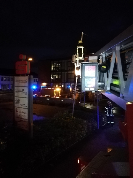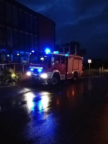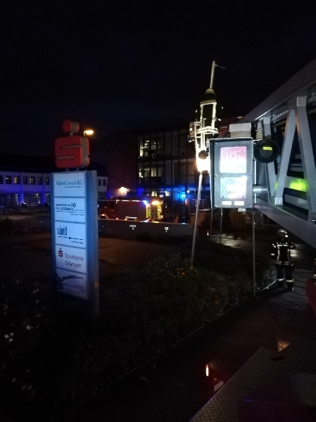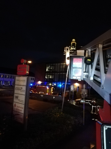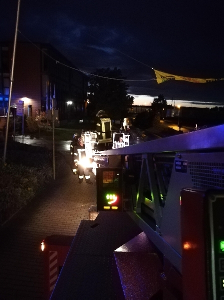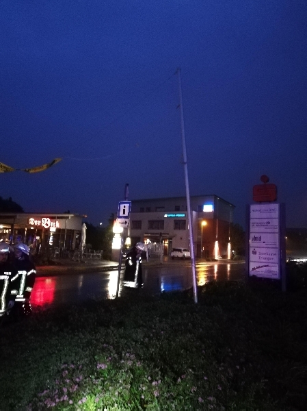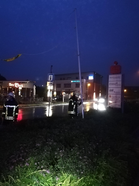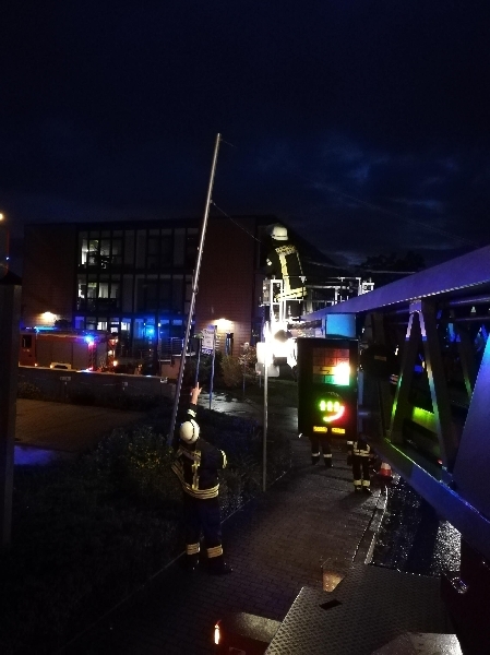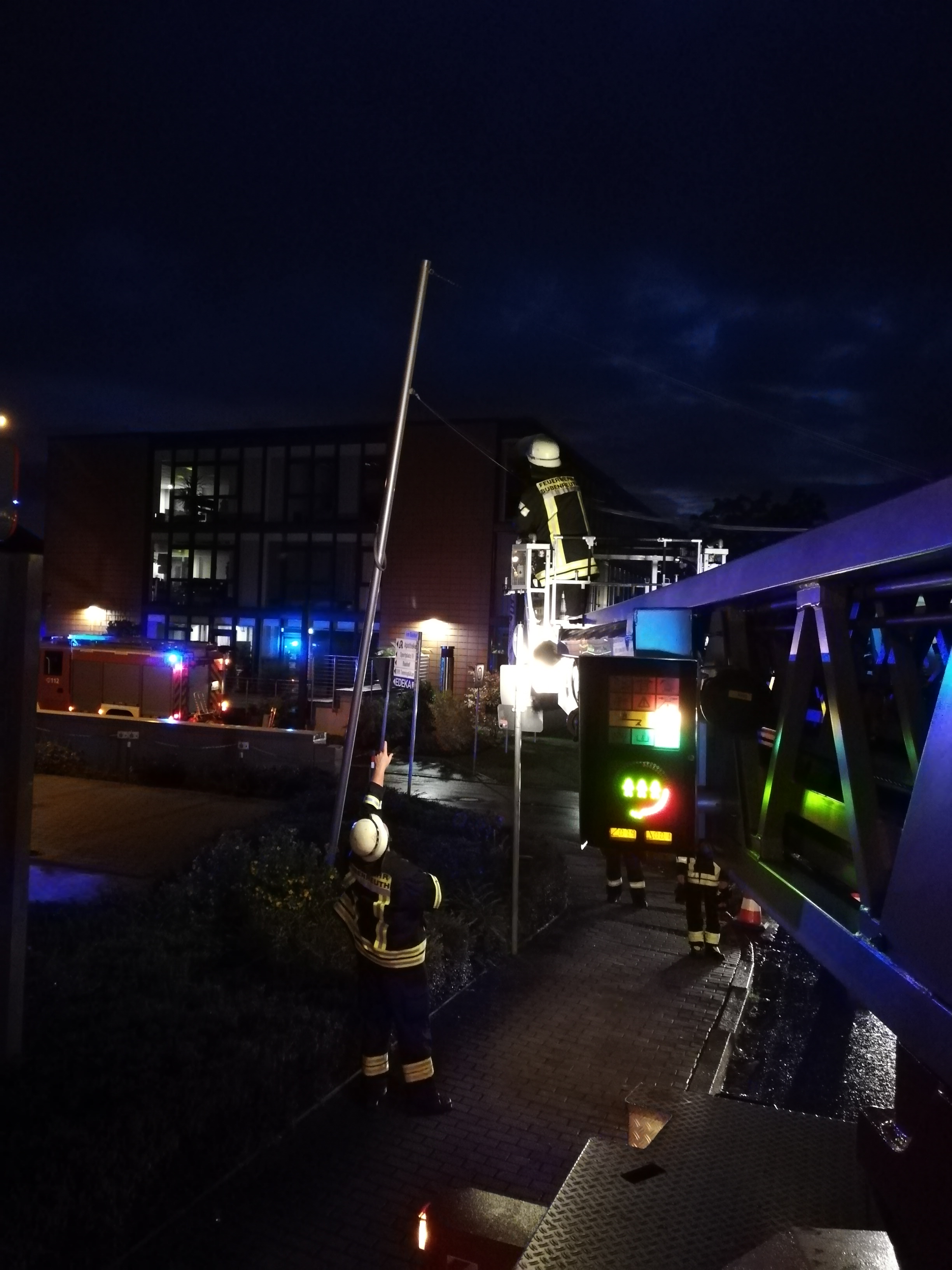Die ILS Nürnberg alarmierte die Feuerwehr Bubenreuth in die Neue Straße. Hier drohte ein Fahnenmast auf die Fahrbahn zu stürzen. Das befestigte Banner wurde Hilfe der Drehleiter entfernt und der Fahnenmast demontiert.