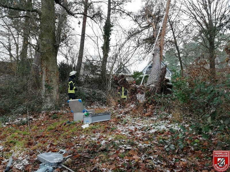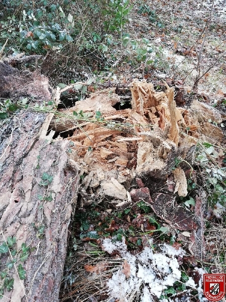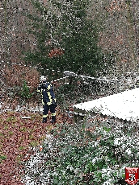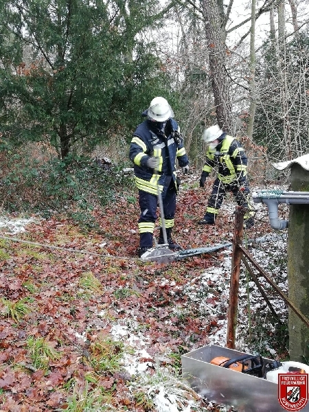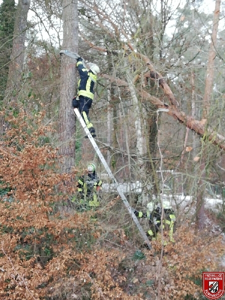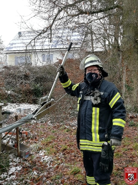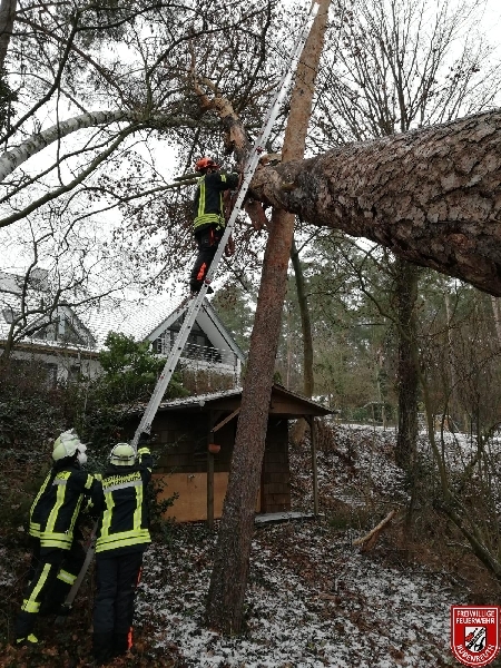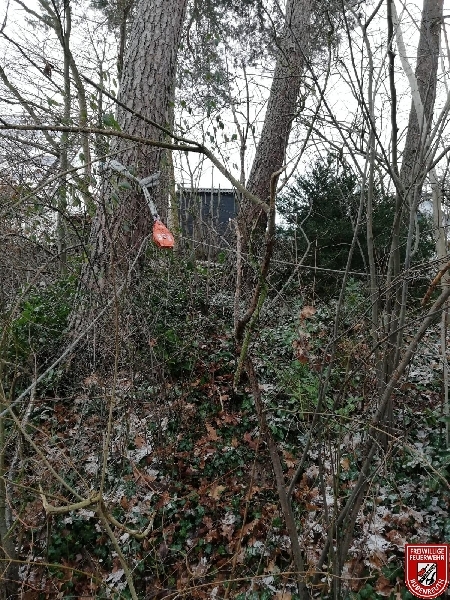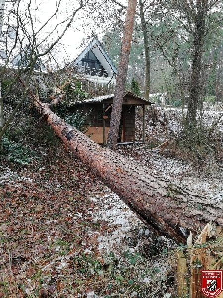 Am Sonntag den 24.1.2021 fand für die Kameraden der Feuerwehr Bubenreuth die erst Unterrichtseinheit zum Thema Unfallverhütung und tragbare Leitern statt. Wegen der aktuellen Pandemie konnte diese selbstverständlich nur online stattfinden. Kurz nachdem mit der Ausbildung begonnen wurde, klingelte jedoch das Telefon unseres Kommandanten Heinrich Herzog. Ein besorgter Bürger meldete, dass sich nach einer kräftigen Windböe ein Baum auf seinem Grundstück entwurzelte und nun drohte auf eine Gartenhütte zu fallen. Umgehend wurde ein Kamerad an die Einsatzstelle geschickt um sich vor Ort ein Bild von der Lage zu machen. Der morsche Baum war entwurzelt und die Krone hatte sich in einer Birke verhangen, welche das zu Boden stürzen verhinderte. Nach kurzer Meldung an den Kommandanten wurde entschieden, dass der Baum umgehend beseitigt werden muss. Acht Kameraden rückten daraufhin mit der Drehleiter und dem ersten HLF an die Einsatzstelle aus. Da ein Abtragen, in kleinen Stücken nicht möglich war, da keine Möglichkeit bestand die Drehleiter zu positionieren musste ein Plan "B" entworfen werden. Die Lösung war schnell Gefunden. Der Baum sollte mit Hilfe eines Mehrzweckzuges und Umlenkrolle in Richtung freies Gelände gezogen werden um die Gartenhütte nicht zu beschädigen. Mit Hilfe der Steckleitern wurde eine Umlenkrolle montiert und der Mehrzweckzug wurde an einem Haltepunkt angeschlagen. Kontrolliert wurde der Baum in Richtung Freifläche gezogen wo er schließlich zu Fall kam ohne die Gartenhütte zu beschädigen. Nach ca. 2 Stunden konnten die Kräfte der Feuerwehr Bubenreuth die Einsatzstelle an den Mieter übergeben und in das Gerätehaus einrücken.