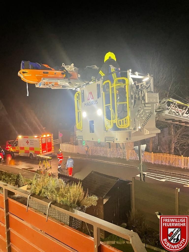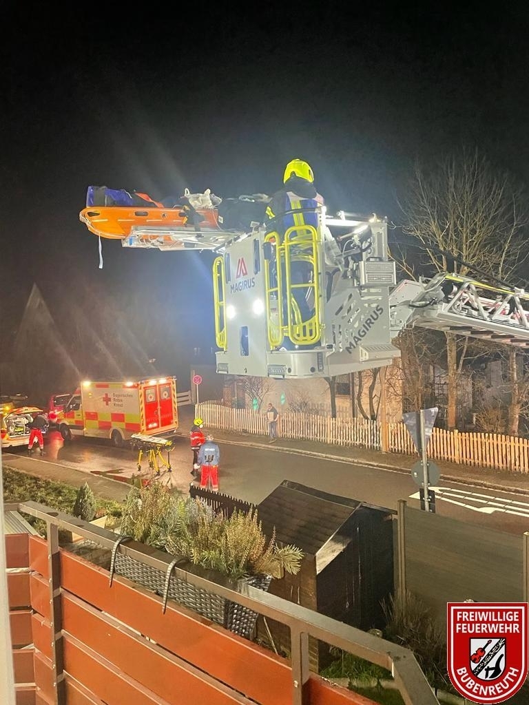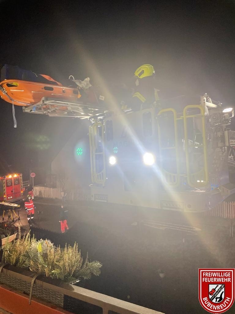 Die Leitstelle Nürnberg alarmierte am 22.02.2022 um 20:05 Uhr den First Responder Bubenreuth gemeinsam mit einem Rettungswagen und dem Notarzt in die Hauptstraße zu einem internistischen Notarzteisatz. An der Einsatzstelle fanden wir einen kritischen Patienten vor, welcher nach sofortiger Stabilisation der Vitalfunktionen in ein nahegelegenes Krankenhaus transportiert werden musste. Da sich der Transport durch das enge Treppenhaus schwierig gestalten würde, entschieden die Rettungskräfte die Drehleiter der Feuerwehr Bubenreuth zur schonenden Rettung anzufordern.