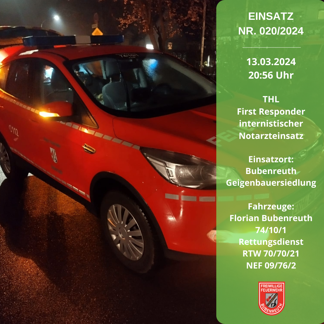 +++ 13.03.2024 / 20:56 Uhr --- Einsatz Nr. 020/2024 --- internistischer Notarzteinsatz --- Bubenreuth Geigenbauersiedlung --- Einsatz für den First Responder +++