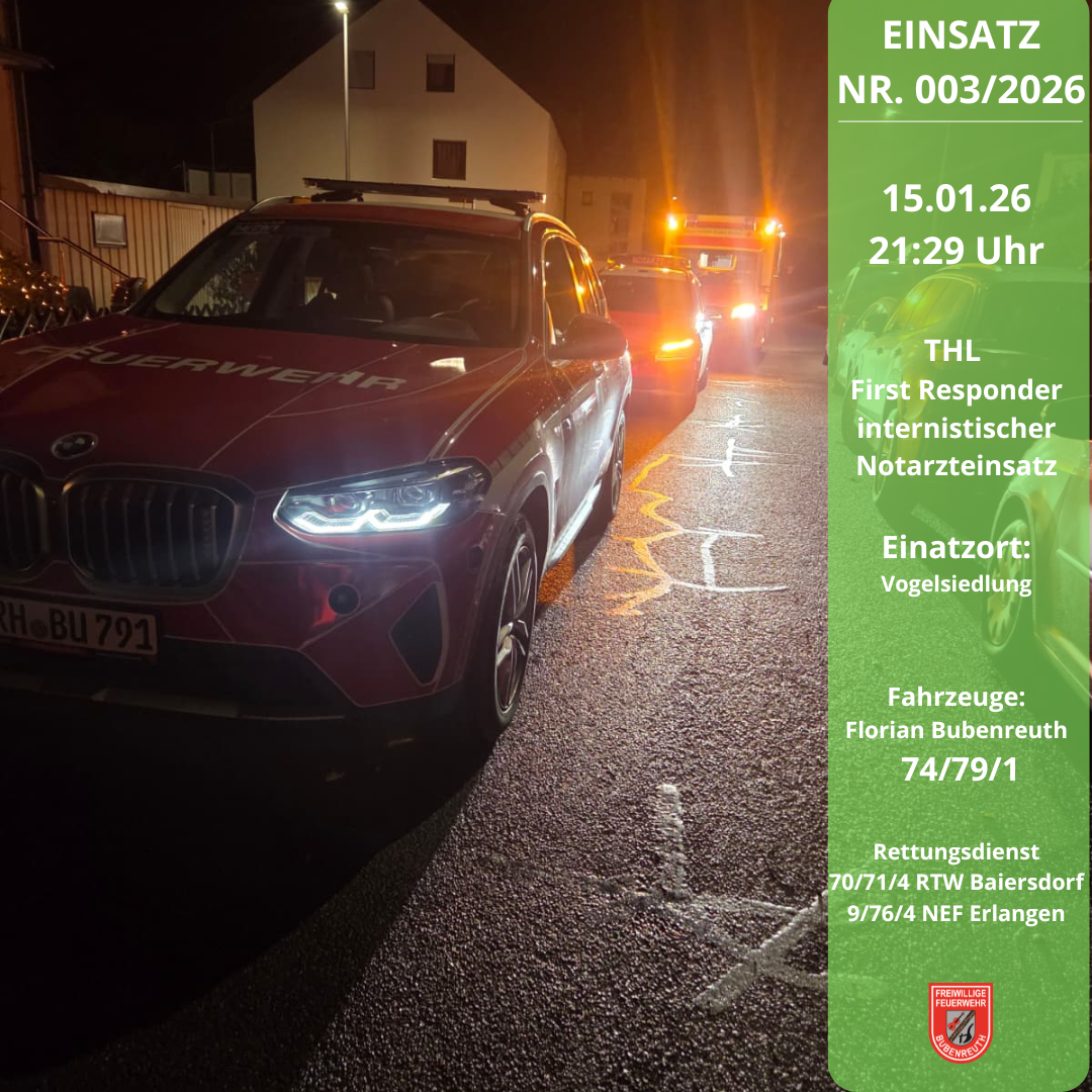 Die Leitstelle Nürnberg alarmierte am 17.01.2026 um 17:34 Uhr die Kollegen des First Responder Bubenreuth gemeinsam mit einem Rettungswagen und dem Notarzt zu einem internistischen Notarzteinsatz in die Geigenbauersiedlung nach Bubenreuth. Hier war leider kein Eingreifen durch die Kollegen mehr erforderlich.